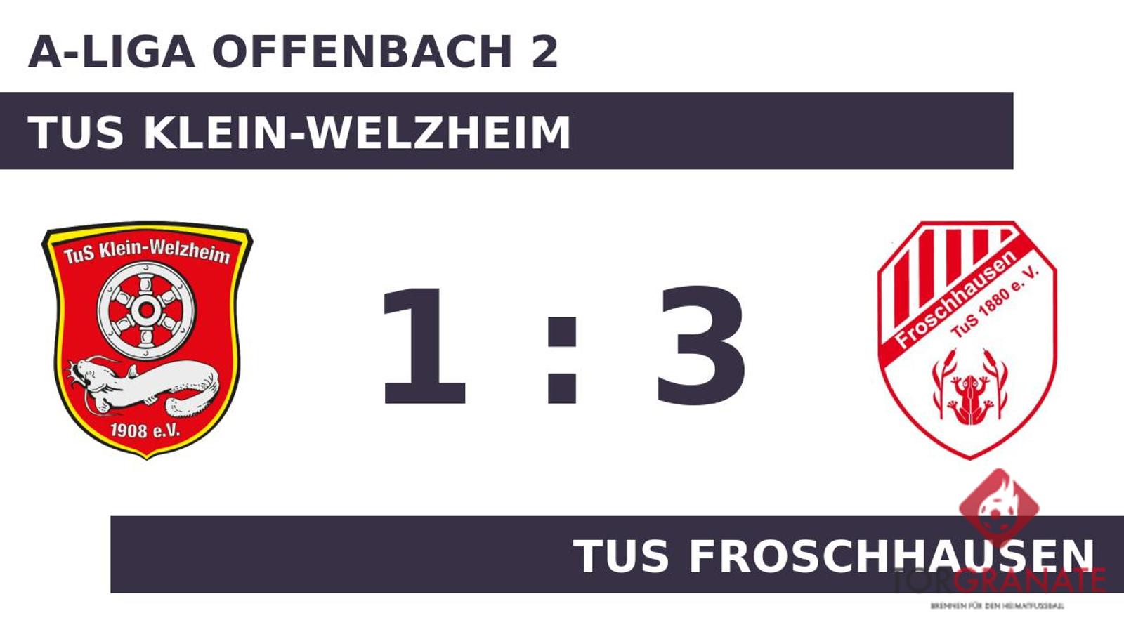 Nach nur 25 Minuten verließ Robin Bergmann von der TUS Froschhausen das Feld, Patrick Waider kam in die Partie. Maurizio Portas versenkte den Ball in der 36. Minute im Netz der Gäste. Der Schiedsrichter schickte schließlich beide Mannschaften ohne weitere Änderung am Spielstand in die Kabinen. Mit einem schnellen Doppelpack (56./59.) zum 2:1 schockte Nico Schoebel die TuS Klein-Welzheim und drehte das Spiel. In der 77. Minute erhöhte Fabian Scherer auf 3:1 für die TUS Froschhausen. Nach Beendigung der zweiten Halbzeit hieß das Ergebnis 3:1 zugunsten der TUS Froschhausen.
