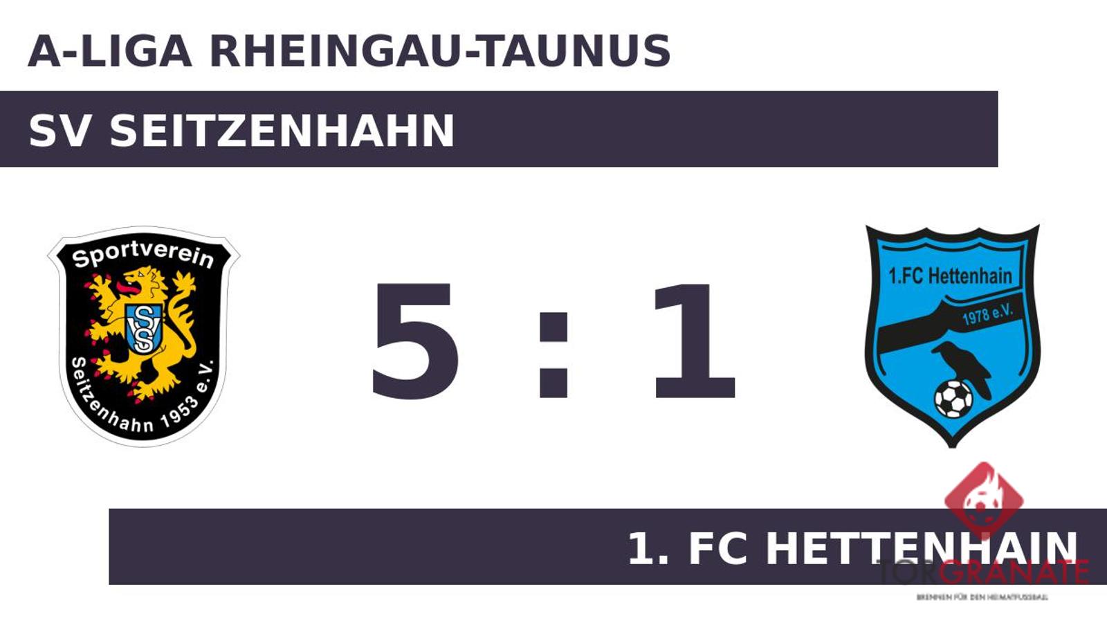 Johannes Groeger brachte den 1. FC Hettenhain per Doppelschlag ins Hintertreffen, als er in der zwölften und 39. Minute vollstreckte. Mit der Führung für den SV Seitzenhahn ging es in die Halbzeitpause. Leon Diefenbach legte in der 49. Minute zum 3:0 für die Gastgeber nach. Dawid Kurek beförderte das Leder zum 1:3 des 1. FC Hettenhain über die Linie (54.). Für das 4:1 des SV Seitzenhahn sorgte Diefenbach, der in Minute 71 zur Stelle war. Ehe der Abpfiff ertönte, war es Benjamin Spiess, der das 5:1 aus Sicht des SV Seitzenhahn perfekt machte (88.). Schlussendlich verbuchte der SV Seitzenhahn gegen den 1. FC Hettenhain einen überzeugenden Heimerfolg.