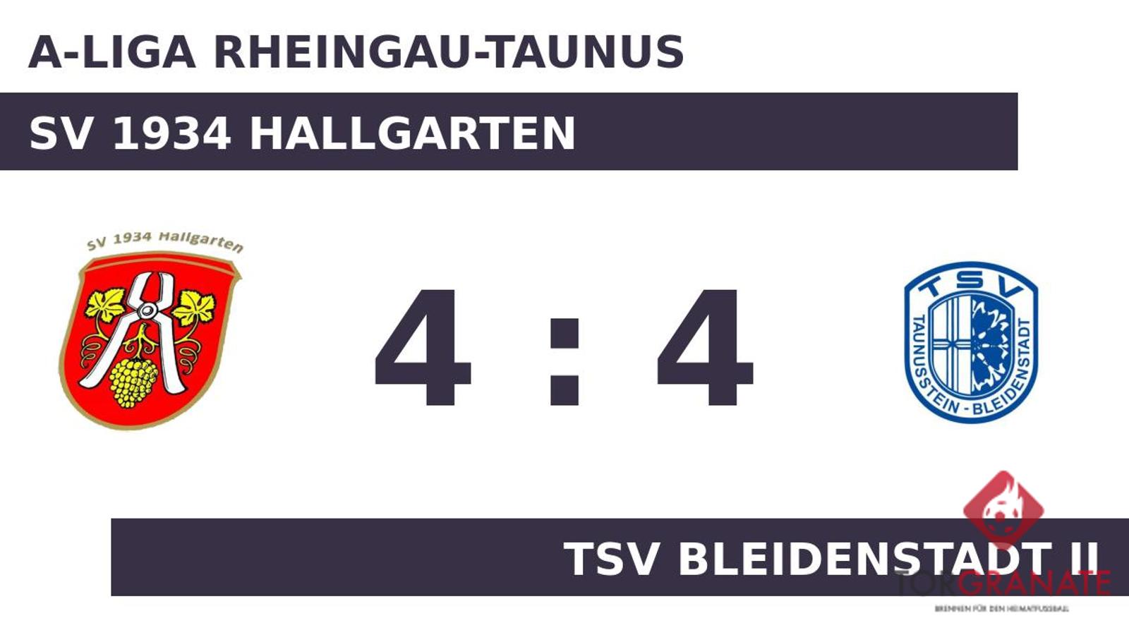 Kaum war das Spiel angepfiffen, lag der SV 1934 Hallgarten bereits in Front. Leandro Moos markierte in der dritten Minute die Führung. Danis Julevic schockte die Heimmannschaft und drehte die Partie mit seinem Doppelpack für den TSV Bleidenstadt II (4./16.). Nach nur 24 Minuten verließ Mirko Radanovic vom TSV Bleidenstadt II das Feld, Sven Heuser kam in die Partie. Innerhalb weniger Minuten trafen Robin Kliemt (42.) und Tobias Kliemt (44.). Damit bewies der SV 1934 Hallgarten nochmals die Durchschlagskraft der Offensive. Der SV 1934 Hallgarten hatte zur Pause eine knappe Führung auf dem Zettel stehen. In der 66. Minute brachte Tim Schuck das Netz für den SV 1934 Hallgarten zum Zappeln. Durchsetzungsstark zeigte sich der TSV Bleidenstadt II, als Francesco Daddario (71.) und Zekaryas Endale (77.) schnell nacheinander im gegnerischen Strafraum zuschlugen. Beim Abpfiff durch den Unparteiischen Muharrem Canel (Hofheim am Taunus) stand es zwischen dem SV 1934 Hallgarten und dem TSV Bleidenstadt II pari, sodass sich beide mit jeweils einem Punkt begnügen mussten.