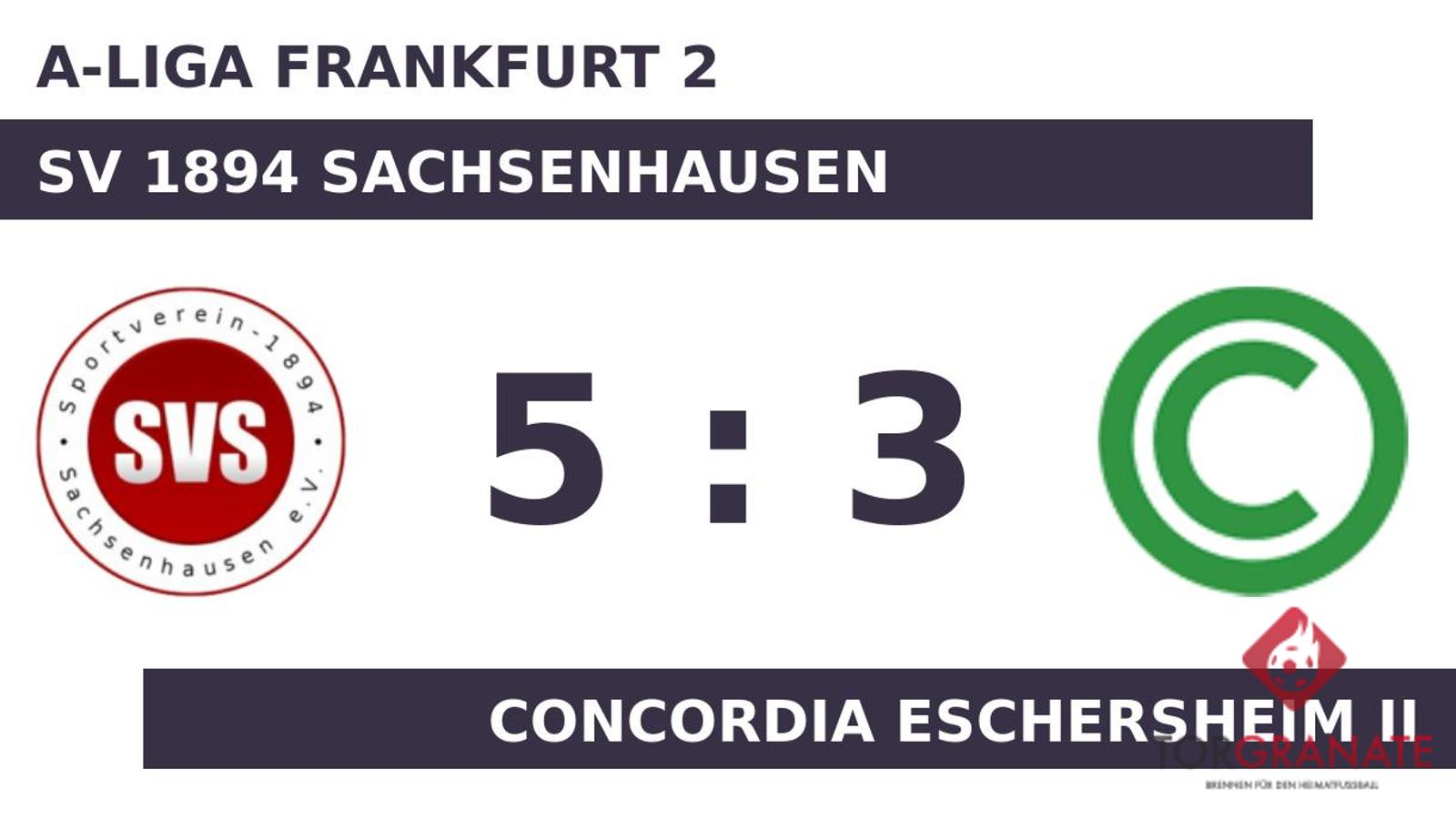 Cosimo Vasta brachte dem SV Sachsenhausen nach 19 Minuten die 1:0-Führung. Julius Ester traf zum 1:1 zugunsten der Concordia Eschersheim II (29.). Mit einem schnellen Doppelpack (32./34.) zum 3:1 schockte Vasta die Gäste. Mit der Führung für den SV 1894 Sachsenhausen ging es in die Halbzeitpause. In Durchgang zwei lief Booto Ipeke anstelle von Tobias Pruessmeier für die Conc. Eschersheim II auf. Anstelle von Maximilian Johannes Walter Gärtner war nach Wiederbeginn Filipe Manuel Texeira Miranda für den SV Sachsenhausen im Spiel. Vasta führte sein Team heute beinahe im Alleingang zum Erfolg: Mit dem 4:1 war er schon das vierte Mal an diesem Tag erfolgreich (52.). Ipeke war zur Stelle und markierte das 2:4 der Concordia Eschersheim II (83.). Für ruhige Verhältnisse sorgte Jan-Niklas Otte, als er das 5:2 für den SV 1894 Sachsenhausen besorgte (88.). Justin Mathwig schoss die Kugel zum 3:5 für die Conc. Eschersheim II über die Linie (90.). Am Schluss gewann der SV Sachsenhausen gegen die Concordia Eschersheim II.