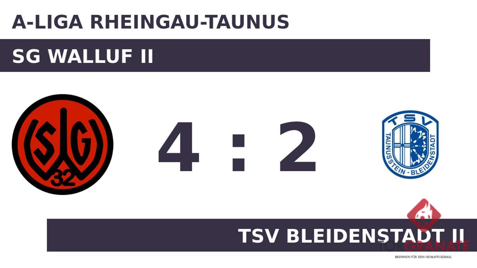 Nils Balder brachte die SG Walluf II in der 35. Spielminute in Führung. Zur Pause behielten die Gastgeber die Nase knapp vorn. Tobias Bellin erhöhte für die SG Walluf II auf 2:0 (46.). Isaq Zahadad brachte die SG Walluf II in ruhiges Fahrwasser, indem er das 3:0 erzielte (54.). Mit dem 4:0 durch Gabriel Cuomo schien die Partie bereits in der 59. Minute mit der SG Walluf II einen sicheren Sieger zu haben. Felix Getto verkürzte für den TSV Bleidenstadt II später in der 72. Minute auf 1:4. Kurz vor Ultimo war noch Francesco Daddario zur Stelle und zeichnete für das zweite Tor des Gasts verantwortlich (87.). Letzten Endes holte die SG Walluf II gegen den TSV Bleidenstadt II drei Zähler.