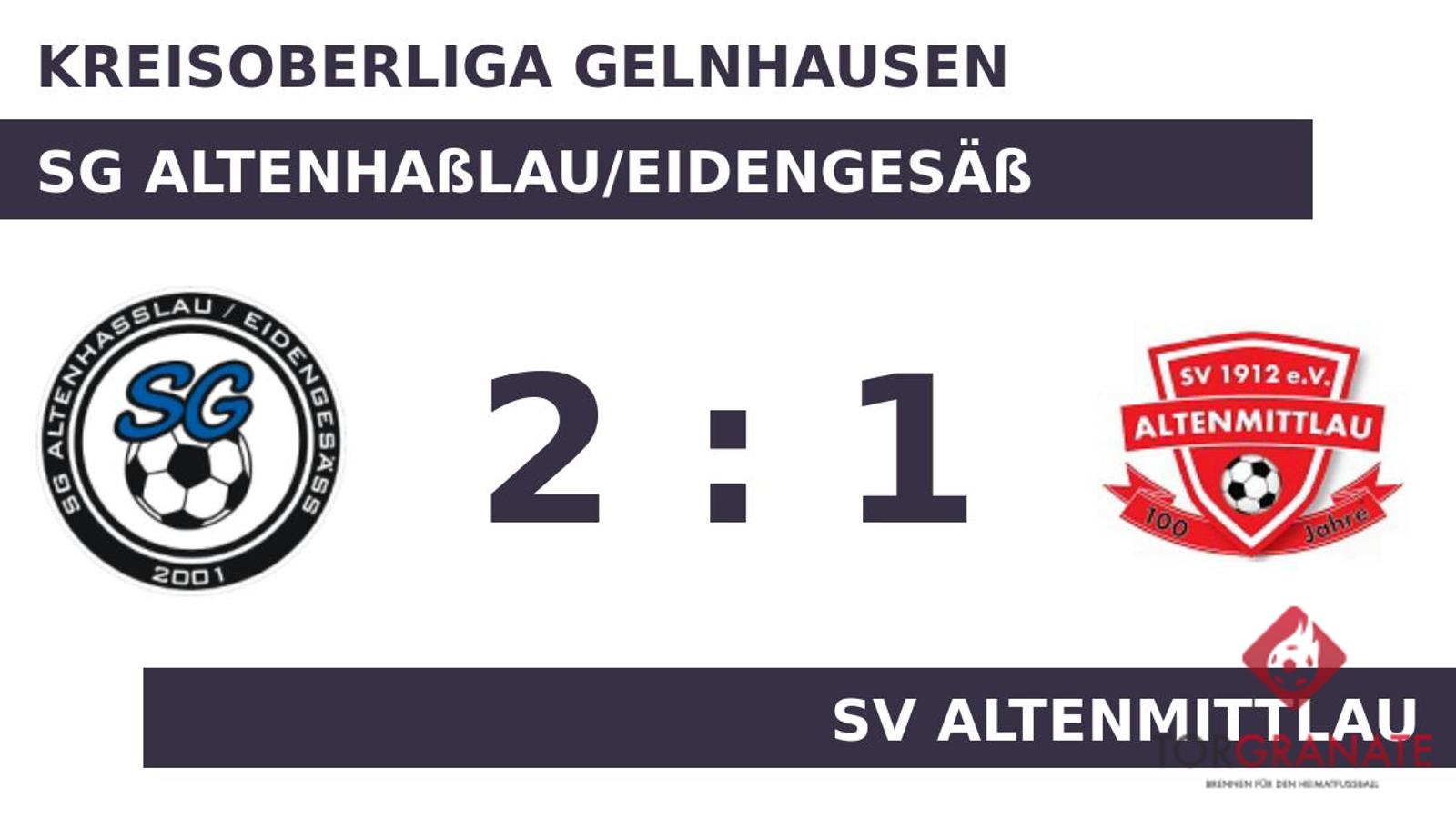 Für den Führungstreffer des Altenhaßlau/Eid. zeichnete Luca Schoener verantwortlich (34.). Kurz vor dem Halbzeitpfiff (42.) baute Joshua Altmann die Führung der Zweier-Spielgemeinschaft aus. Mit der Führung für das Heimteam ging es in die Halbzeitpause. Mario Grohs ließ sich in der 51. Minute nicht zweimal bitten und verwertete zum 1:2 für den SV Altenmittlau. Obwohl der SG Altenhaßlau/Eidengesäß nach erfolgreicher erster Hälfte keine weiteren Tore gelangen, schaffte es der SV Altenmittlau zugleich nicht, die Partie zu drehen. Sie endete mit 2:1.