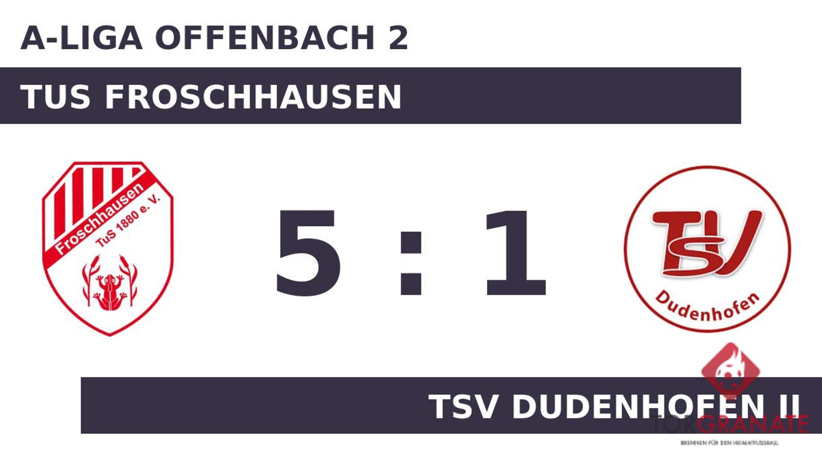 Für den Führungstreffer der TUS Froschhausen zeichnete Robin Junker verantwortlich (12.). Nico Schoebel trug sich in der 22. Spielminute in die Torschützenliste ein. Bis zur Pause fiel kein weiteres Tor, sodass es schließlich mit unverändertem Ergebnis in die Kabinen ging. Das 3:0 für die TUS Froschhausen stellte Schoebel sicher. In der 64. Minute traf er zum zweiten Mal während der Partie. Marc Philipp Sommer beförderte das Leder zum 1:3 von TSV Dudenhofen II über die Linie (65.). Mit dem Tor zum 4:1 steuerte Schoebel bereits seinen dritten Treffer an diesem Tag bei (73.). Benjamin Lemke besorgte in der Schlussphase schließlich den fünften Treffer für die TUS Froschhausen (77.). Letztlich feierte die TUS Froschhausen gegen TSV Dudenhofen II nach einer überzeugenden Darbietung einen verdienten Heimsieg.