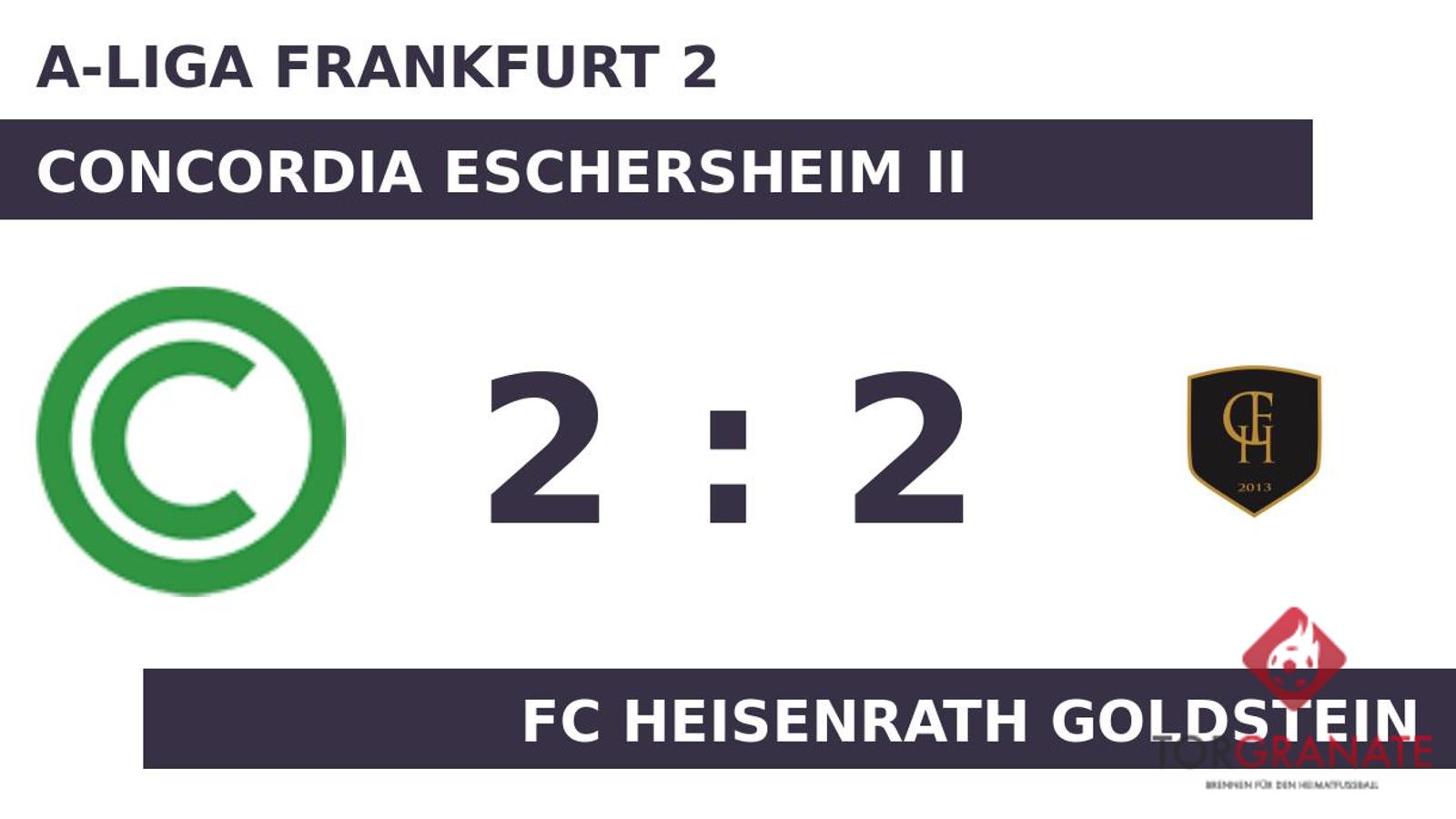 Torlos ging es zur Halbzeitpause in die Kabinen. In Durchgang zwei lief Booto Ipeke anstelle von Noah Bitter für die Concordia Eschersheim II auf. Das Heimteam ging durch Ipeke in der 47. Minute in Führung. In der 61. Minute stellte die Conc. Eschersheim II personell um: Per Doppelwechsel kamen Tobias Pruessmeier und Len Santiago Lockl auf den Platz und ersetzten Julius Ester und Pascal Stoelze. In der 73. Minute brachte Farid Seydou Kolou den Ball im Netz der Concordia Eschersheim II unter. Das Spiel neigte sich seinem Ende entgegen, als Tobias Mahler einen Treffer für den FC Heisenrath im Ärmel hatte (82.). Kurz vor Ende der Partie war es Pruessmeier, der die Conc. Eschersheim II rettete und den Ausgleich markierte (85.). Dass die Partie keinen Sieger finden würde, war besiegelte Sache, als Referee Andreas Steffen Doil (Frankfurt am Main) die Begegnung beim Stand von 2:2 schließlich abpfiff.