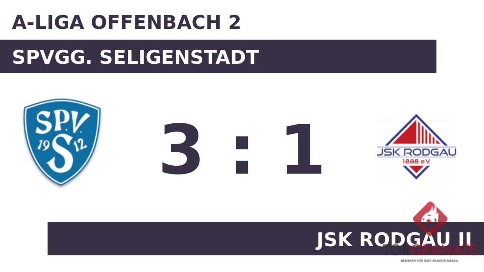 Justin Dingler brachte die Spvgg. Seligenstadt in der zehnten Minute in Front. Gökmen Sinan war zur Stelle und markierte das 2:0 der Heimmannschaft (18.). Mit der Führung für den Tabellenprimus ging es in die Kabine. Zum Seitenwechsel ersetzte Kevin Kiefer vom JSK Rodgau II seinen Teamkameraden Marin Peric. Die Spvgg. Seligenstadt konnte mit dem ersten Durchgang sehr zufrieden sein. Trotzdem gab es Veränderungen bei der Spvgg. Seligenstadt. Cain Kunkel ersetzte Artur Martel, der nun schon vorzeitig Feierabend machte. Ilias Bouhaddouz schoss für den JSK Rodgau II in der 52. Minute das erste Tor. Semir Arnautovic verwandelte in der 80. Minute einen Elfmeter und baute den Vorsprung der Spvgg. Seligenstadt auf 3:1 aus. Mit dem Schlusspfiff durch Referee Karl-Heinz Kaupp (Bad Soden-Salmünster) siegte die Spvgg. Seligenstadt gegen den JSK Rodgau II.