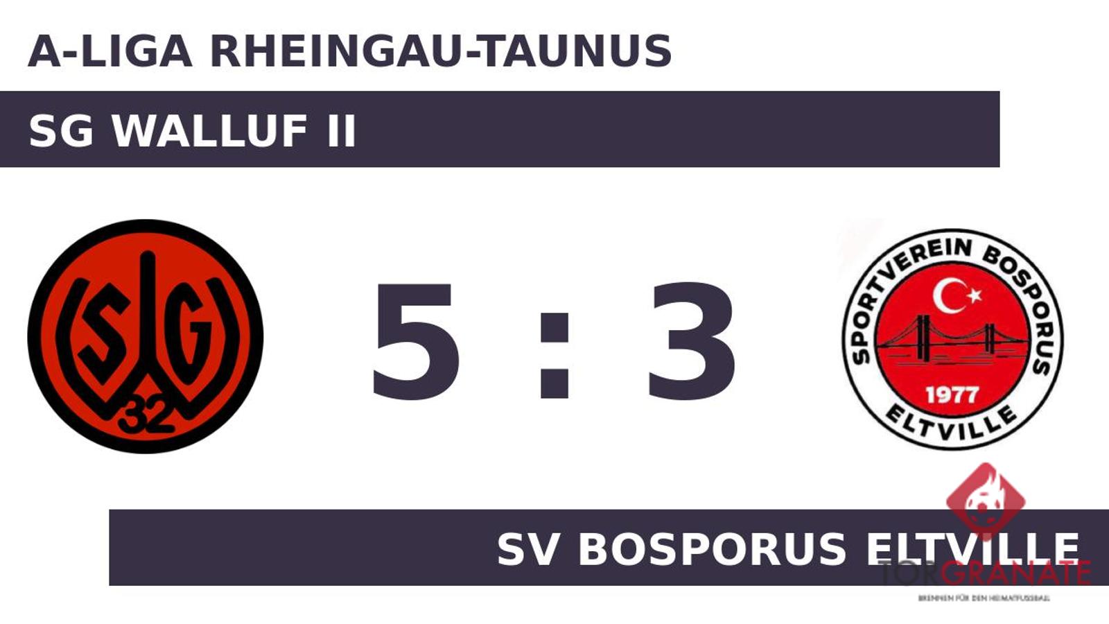 Der SV Bosporus Eltville musste den Treffer von Marc Krabler zum 1:0 hinnehmen (32.). Die Gäste kamen durch ein Eigentor der SG Walluf II in der 35. Minute zum Ausgleich. Gabriel Cuomo brachte den Ball zum 2:1 zugunsten der SG Walluf II über die Linie (39.). Zum Seitenwechsel ersetzte Abdullah Yildirim vom SV Bosporus Eltville seinen Teamkameraden Can Bata. Den Unterschied zwischen den beiden Mannschaften machte bis zur Pause lediglich ein Treffer aus, den die SG Walluf II für sich beanspruchte. Moritz Freiling (49.), Krabler (55.) und Cuomo (57.) ließen im weiteren Verlauf keine Zweifel am Sieg der Heimmannschaft aufkommen. Eine starke Leistung zeigte Kamil Kutluata, der sich mit einem Doppelpack für den SV Bosporus Eltville beim Trainer empfahl (64./83.). Letzten Endes holte die SG Walluf II gegen den SV Bosporus Eltville drei Zähler.