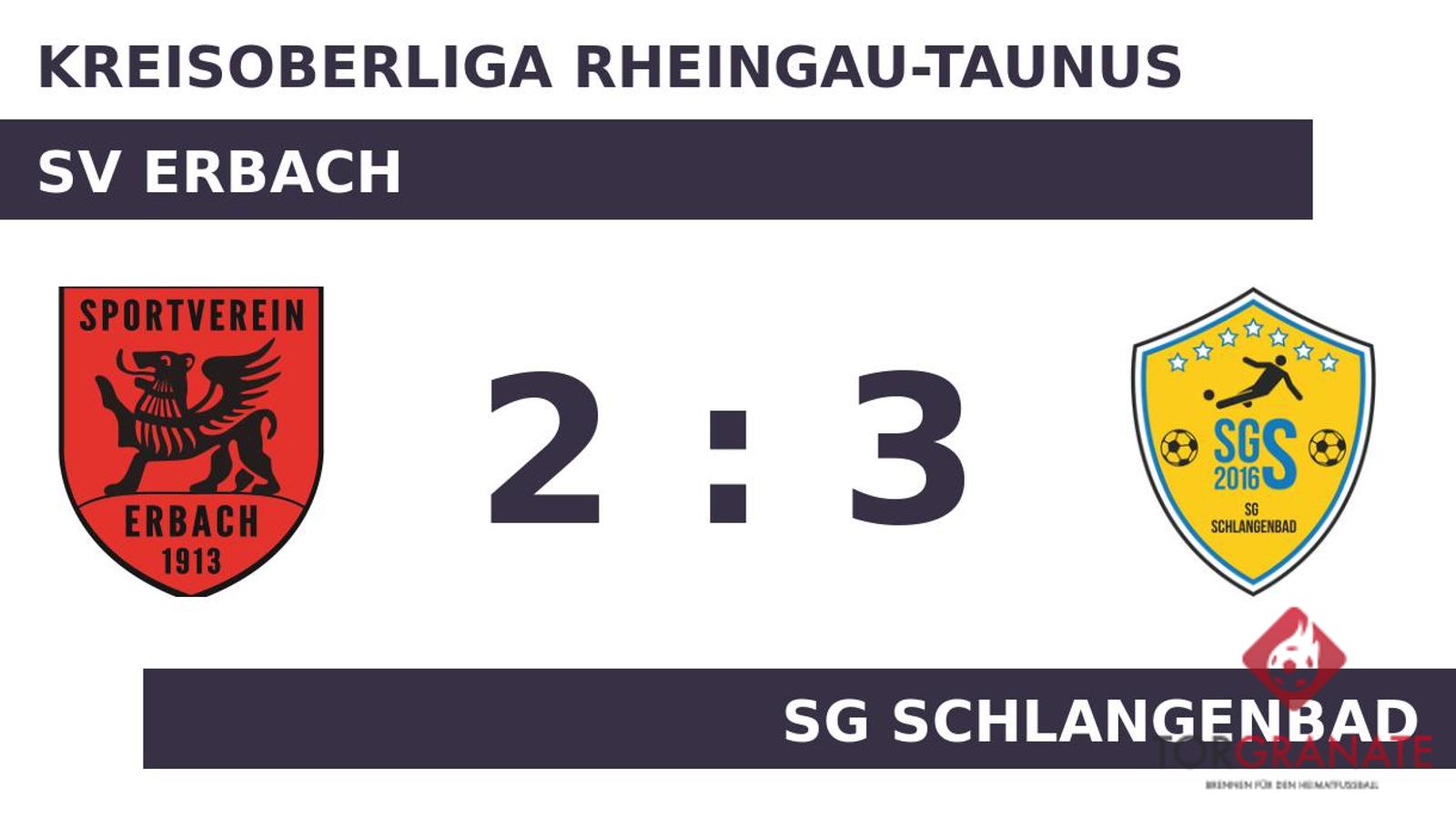 Der SV Erbach erwischte einen Blitzstart ins Spiel. Malik Ramadani traf in der fünften Minute zur frühen Führung. Vincent Schäfer schockte das Heimteam und drehte die Partie mit seinem Doppelpack für die SG Schlangenbad (11./28.). Kurz vor dem Halbzeitpfiff (42.) baute Hendrick Schäfer die Führung der SG Schlangenbad aus. Es waren die Gäste, die zur Pause eine Führung ihr Eigen nannten. Alexander Hoerr war zur Stelle und markierte das 2:3 des SV Erbach (72.). Obwohl der SG Schlangenbad nach erfolgreicher erster Hälfte keine weiteren Tore gelangen, schaffte es der SV Erbach zugleich nicht, die Partie zu drehen. Sie endete mit 3:2.