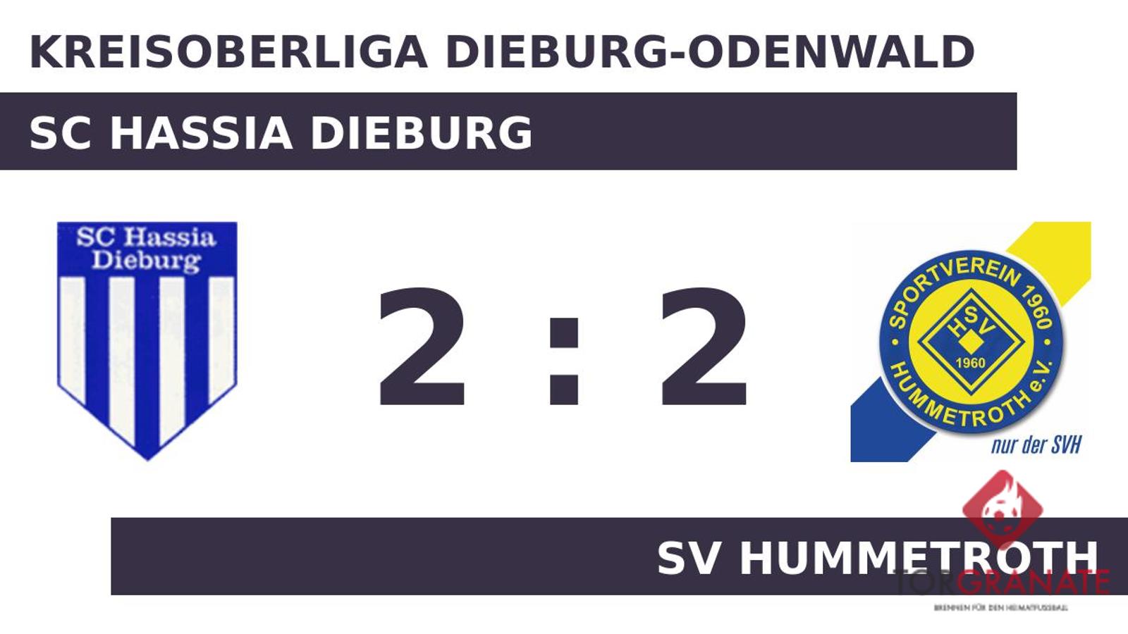 Auf die vermeintliche Siegerstraße brachte Cedric Robin Fuhlbrügge sein Team in der neunten Minute. Ohne weitere Tore ging es in die Pause. Daniele Toch war es, der in der 84. Minute den Ball im Gehäuse des SC Hassia Dieburg unterbrachte. Für das 2:1 zugunsten des SV Hummetroth sorgte dann kurz vor Schluss Giuseppe Burgio, der den Gast und die Fans von einer Spitzenplatzierung träumen ließ (86.). Mit seinem Treffer aus der 90. Minute bewahrte Marco Jakob seine Mannschaft vor der Niederlage und machte kurz vor dem Abpfiff das Remis perfekt. Am Schluss hatte im Duell der beiden Mannschaften keine die Oberhand gewonnen und so trennten sich der SC Hassia Dieburg und der SV Hummetroth schließlich mit einem Remis.