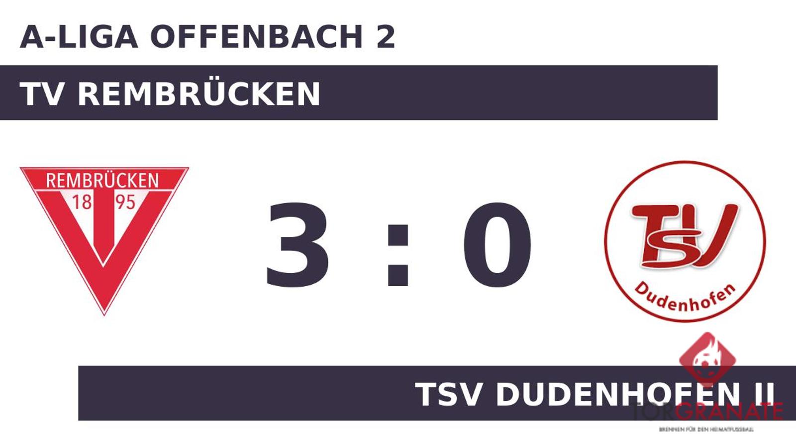 Vedran Martinko nutzte die Chance für den TV Rembrücken und beförderte in der 20. Minute das Leder zum 1:0 ins Netz. TSV Dudenhofen II war gewillt auszugleichen. Bis zum Seitenwechsel sprang jedoch nichts Zählbares mehr heraus. Für das 2:0 des TV Rembrücken zeichnete Christian Steinheimer verantwortlich (69.). In der 71. Minute legte Niklas Hofmann zum 3:0 zugunsten des Heimteams nach. Mit dem Schlusspfiff durch den Unparteiischen Bilal Can (Frankfurt am Main) siegte der TV Rembrücken gegen TSV Dudenhofen II.