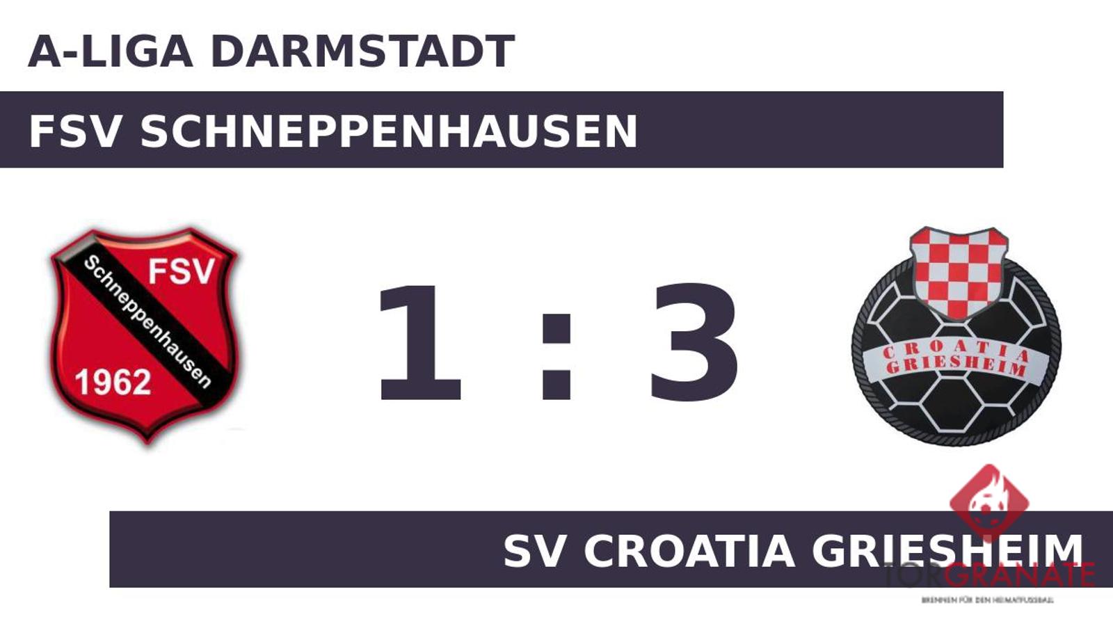 Für das erste Tor sorgte Munir Avdic. In der zwölften Minute traf der Spieler der Gäste ins Schwarze. Ehe es in die Kabinen ging, markierte k. A. das 1:1 für den FSV Schneppenhausen (41.). Zum Seitenwechsel hatte keine Mannschaft die Oberhand gewonnen. Unentschieden lautete der Zwischenstand. Sasa Mlakic schoss für den SV Croatia Griesheim in der 68. Minute das zweite Tor. In der 69. Minute stellte der SV Croatia Griesheim personell um: Per Doppelwechsel kamen Salvatore Segreto und Dominik Bralic auf den Platz und ersetzten Josip Vujica und Mario Marcic. Ehe der Abpfiff ertönte, war es Mate Tokic, der das 3:1 aus Sicht des SV Croatia Griesheim perfekt machte (90.). Am Ende verbuchte der SV Croatia Griesheim gegen den FSV Schneppenhausen einen Sieg.