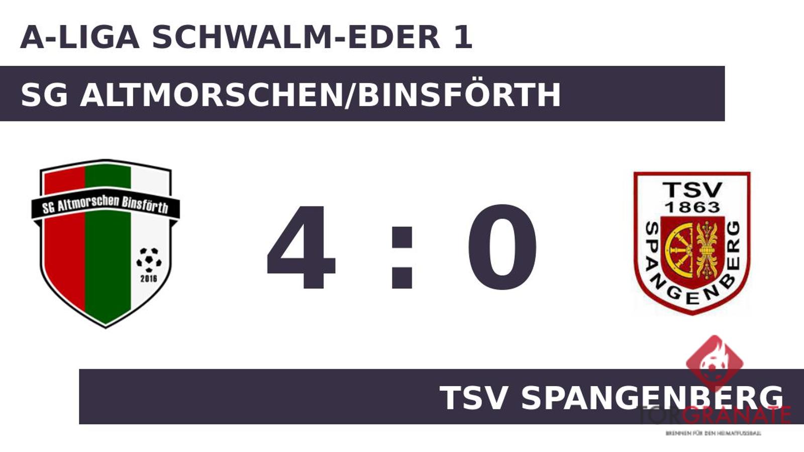 In der sechsten Minute fiel der Führungstreffer für Altmorschen/Binsf. mit einem Eigentor. David Ziegert erhöhte für die Gastgeber auf 2:0 (20.). Nach nur 30 Minuten verließ Eugen Grelich von der SG Altmorschen/Binsförth das Feld, Nazieh Al Rashed kam in die Partie. Mit der Führung für Altmorschen/Binsf. ging es in die Kabine. In der Pause stellte der TSV Spangenberg personell um: Per Doppelwechsel kamen Cezar-Robert Monoreanu und Jonas Plettenberg auf den Platz und ersetzten Oliver Karius und Simon Rode. Ziegert beseitigte mit seinen Toren (66./86.) die letzten Zweifel am Sieg der SG Altmorschen/Binsförth. Letztlich feierte Altmorschen/Binsf. gegen den TSV Spangenberg nach einer überzeugenden Darbietung einen verdienten Heimsieg.