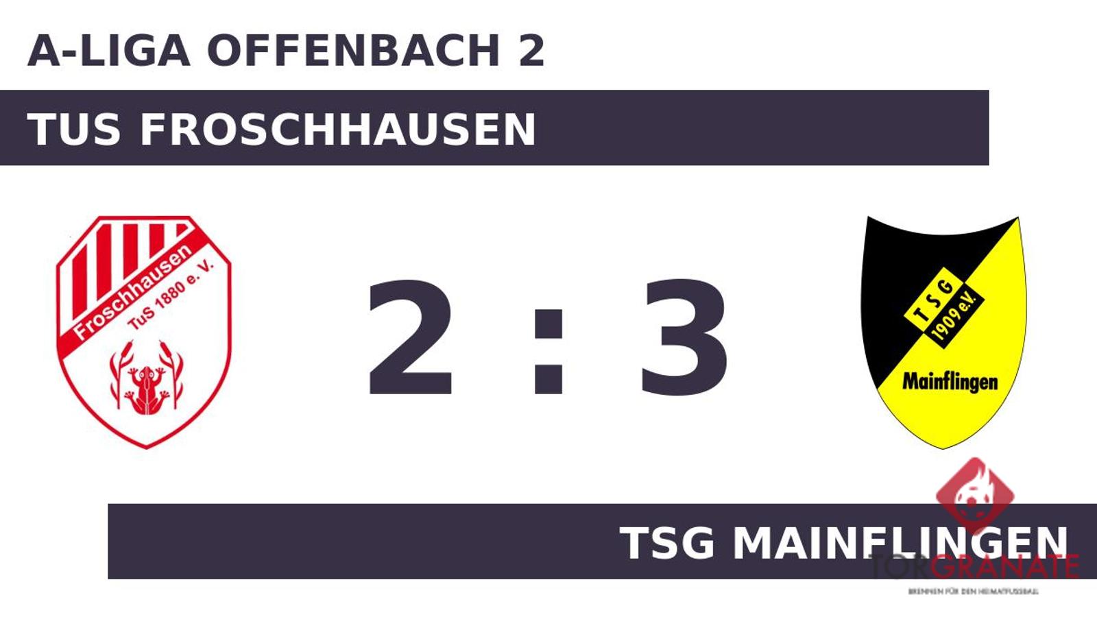 Das erste Tor des Spiels ging an die TSG Mainflingen. Allerdings gelang dies nur mithilfe der TUS Froschhausen: 1:0 für die TSG Mainflingen durch ein Eigentor in der 20. Minute. Um den entscheidenden Deut besser war zur Pause die TSG Mainflingen, sodass es mit einer dünnen Führung in die Kabine ging. In der Halbzeit nahm die TUS Froschhausen gleich zwei Wechsel vor. Fortan standen Nico Schoebel und Sascha Hark für Benjamin Lemke und Oliver Bergmann auf dem Platz. Die TSG Mainflingen baute den Vorsprung mit der Hilfe des Gegners weiter aus: 2:0 für die Gäste durch ein Eigentor der TUS Froschhausen in der 56. Minute. Peter Kaden vollendete zum dritten Tagestreffer in der 58. Spielminute. In der 67. Minute brachte Schoebel das Netz für die TUS Froschhausen zum Zappeln. Robin Junker schoss für den Gastgeber in der 70. Minute das zweite Tor. Nachdem die TUS Froschhausen zunächst völlig von der Rolle gewesen war, zog sie sich am Ende zumindest noch achtbar aus der Affäre. Zu einem Punktgewinn reichte es jedoch nicht mehr.