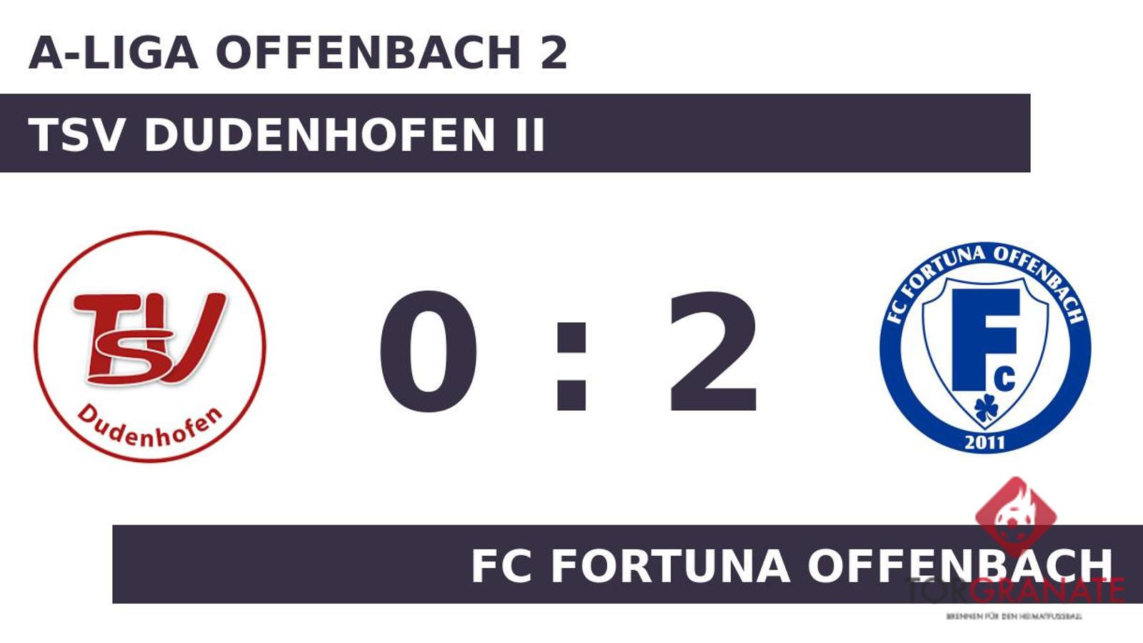 Francesco Vastelli brachte den FC Fortuna Offenbach in der siebten Minute nach vorn. Mit einem Tor Vorsprung für den Gast ging es für die beiden Teams nach dem Pausenpfiff in die Kabinen. Ehe der Abpfiff ertönte, war es Vastelli, der das 2:0 aus Sicht des FC Fortuna Offenbach perfekt machte (89.). Letzten Endes ging der FC Fortuna Offenbach im Duell mit TSV Dudenhofen II als Sieger hervor.