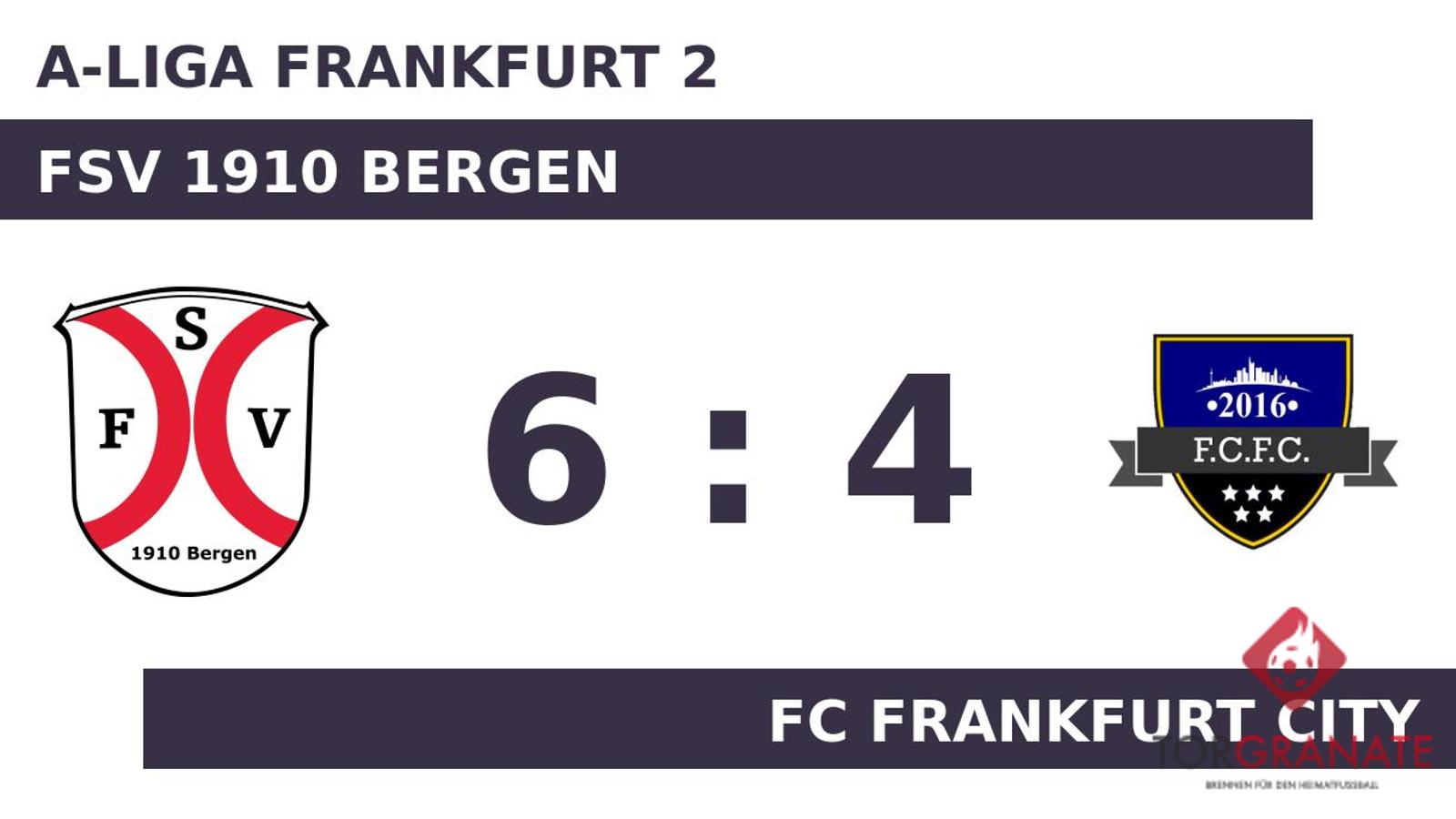 Der Gastgeber erwischte einen Blitzstart ins Spiel. Tomislav Cudina traf in der zweiten Minute zur frühen Führung. In der 22. Minute brachte Ghislain Owona Nkouendjeu den Ball im Netz des FSV 1910 Bergen unter. Das 2:1 des FC Frankfurt City bejubelte k. A. (25.). Der FSV 1910 Bergen zeigte sich unbeeindruckt und so drehten Sascha Martinovic (35.) und Simone Barbera (44.) mit ihren Treffern das Spiel. Zur Pause war der FSV 1910 Bergen im Fahrwasser und verbuchte eine knappe Führung. Die Antwort ließ nicht lange auf sich warten. Wenige Augenblicke später besorgte Önder Balci den Ausgleich (48.). Der Treffer zum 4:3 sicherte dem FSV 1910 Bergen nicht nur die Führung – es war auch bereits der zweite von Barbera in diesem Spiel (62.). Der FC Frankfurt City hatte sich schnell wieder gesammelt und erzielte in Person von Balci den Ausgleich (64.). Durchsetzungsstark zeigte sich der FSV 1910 Bergen, als Patrick Köster (81.) und Barbera (90.) schnell nacheinander im gegnerischen Strafraum zuschlugen. Letzten Endes ging der FSV 1910 Bergen im Duell mit dem FC Frankfurt City als Sieger hervor.