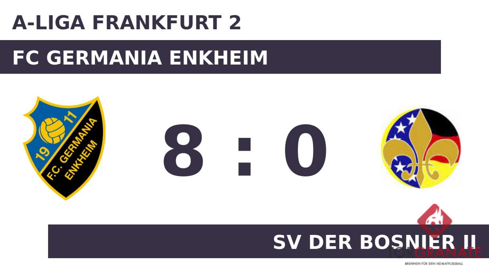 Auf die Stabilität der eigenen Hintermannschaft konnte sich der FC Germania Enkheim beim Sieg gegen SV der Bosnier II verlassen, und auch tabellarisch sieht es für den FC Germania Enkheim weiter verheißungsvoll aus. Mit 59 geschossenen Toren gehört der FC Germania Enkheim offensiv zur Crème de la Crème der A-Liga Frankfurt 2. Nur zweimal gab sich der FC Germania Enkheim bisher geschlagen.