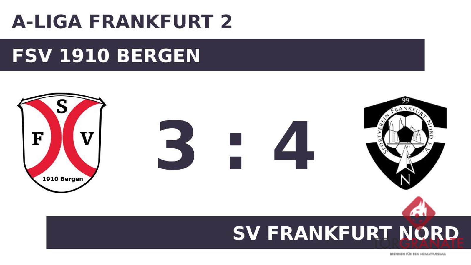 Der Gast geriet schon in der siebten Minute in Rückstand, als Patrick Köster das schnelle 1:0 für den FSV 1910 Bergen erzielte. Der FSV 1910 Bergen machte weiter Druck und erhöhte den Spielstand im Eilschritt durch einen Treffer von Sharafudin Naser (10.). Maik Wagner witterte seine Chance und schoss den Ball zum 1:2 für SV Frankfurt Nord ein (13.). Rashit Gashi musste nach nur 19 Minuten vom Platz, für ihn spielte Florian Mazllomaj weiter. Für das 3:1 des FSV 1910 Bergen zeichnete Josh Haas verantwortlich (21.). Ein Eigentor der Heimmannschaft in der 35. Minute brachte SV Frankfurt Nord den 2:3-Anschluss. Zur Pause behielt der FSV 1910 Bergen die Nase knapp vorn. In der Pause wechselte SV Frankfurt Nord den nominellen Stürmer Advan Cakiqi für Maurizio Tedesco ein. Mit einem Wechsel – Marcel Dücker kam für Haas – startete der FSV 1910 Bergen in Durchgang zwei. Emrah Tahirovic schockte den FSV 1910 Bergen und drehte die Partie mit seinem Doppelpack für SV Frankfurt Nord (48./54.). Die Zeichen standen auf Sieg für den FSV 1910 Bergen, doch gab man eine sichere Führung aus der Hand und kassierte letztlich eine bittere Niederlage.