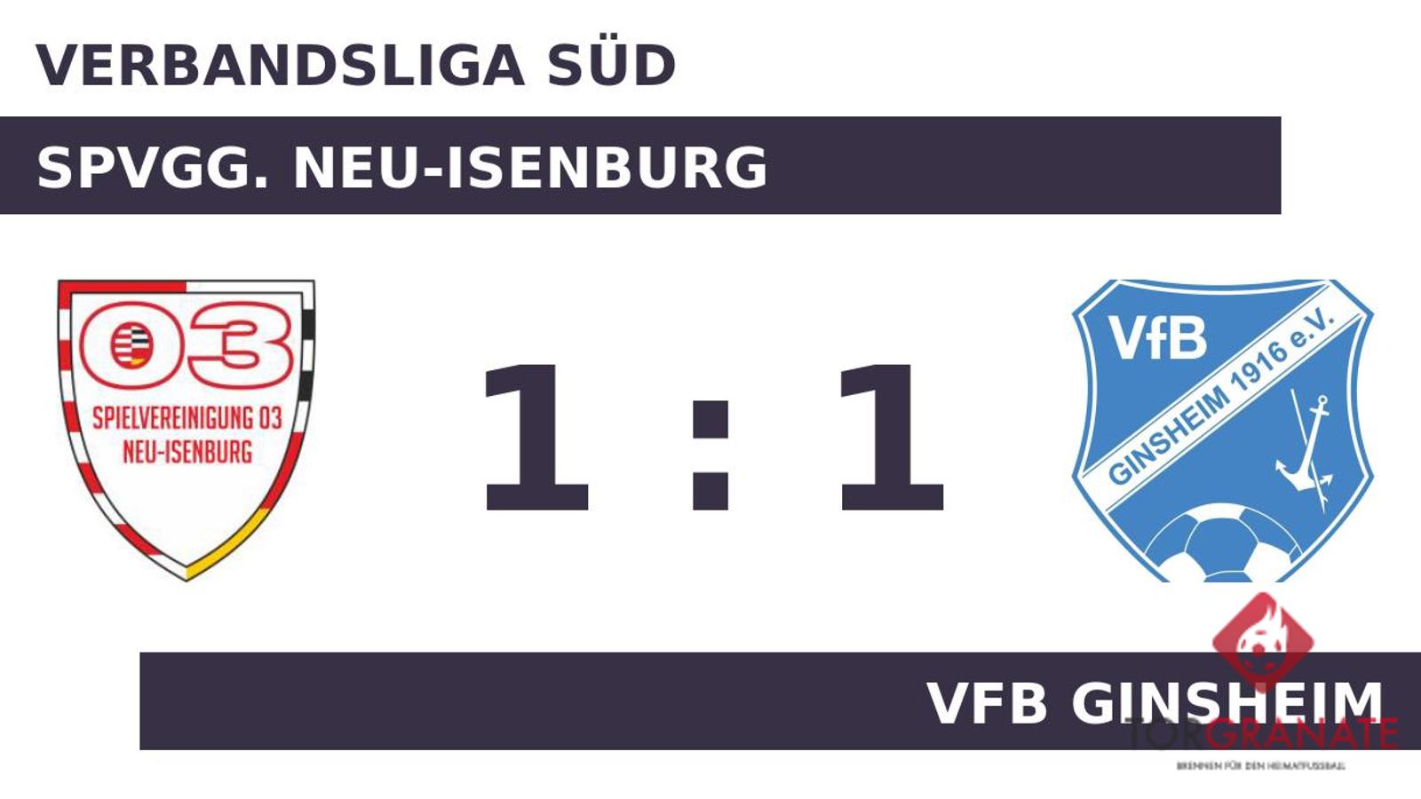 Vor dem Seitenwechsel sorgte Sungmo Hwang mit seinem Treffer für eine kalte Dusche für die Spvgg. Neu-Isenburg. Einen Torerfolg in Halbzeit eins verbuchte lediglich der VfB Ginsheim, womit man eine knappe Führung mit in die Kabinen nahm. In der Pause wechselten die Ginsheimer den nominellen Stürmer Alexander Scholz für Stefan Baljak ein. Die Spvgg. Neu-Isenburg drängte auf den Ausgleich. Für frischen Wind sollten Emre Kaya und Robin Horst sorgen, die per Doppelwechsel für Paul Bickel und Davide Durante auf das Spielfeld kamen (54.). Vladimir Trucic, der von der Bank für Jason Kunth kam, sollte für neue Impulse bei der Spielvereinigung 03 sorgen (65.). In der 68. Minute brachte Trucic den Ball im Netz des VfB Ginsheim unter. Am Schluss hatte im Duell der beiden Mannschaften keine die Oberhand gewonnen und so trennten sich die Spvgg. Neu-Isenburg und der VfB Ginsheim schließlich mit einem Remis.