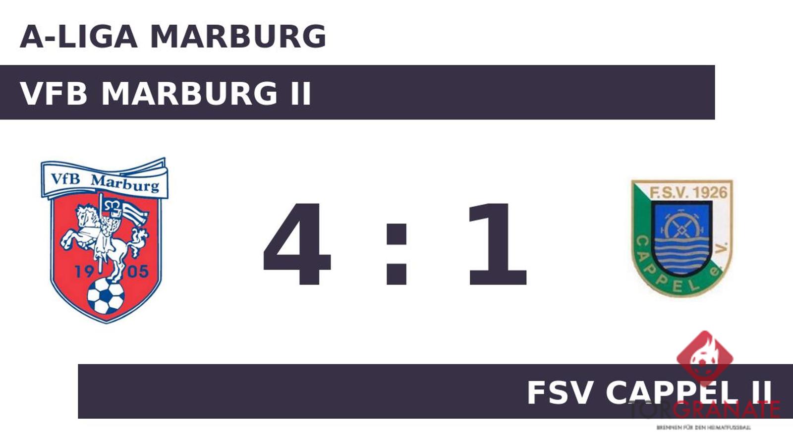 Paul Jost brachte den FSV Cappel II per Doppelschlag ins Hintertreffen, als er in der 15. und 22. Minute vollstreckte. Mohamed Chkeir war es, der in der 38. Minute den Ball im Gehäuse des VfB Marburg II unterbrachte. Der VfB Marburg II nahm die knappe Führung mit in die Kabine. In der Halbzeit nahm der FSV Cappel II gleich zwei Wechsel vor. Fortan standen Moritz Seffer und Daniel Mehrlein für Jonas Jaeckel und Navid Rahman Ghafury auf dem Platz. Jost beseitigte mit seinen Toren (60./88.) die letzten Zweifel am Sieg des VfB Marburg II. Ein starker Auftritt ermöglichte dem VfB Marburg II am Sonntag einen ungefährdeten Erfolg gegen den FSV Cappel II.