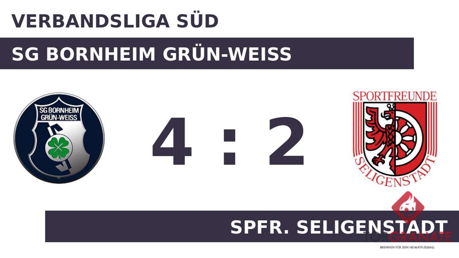 Für den Führungstreffer der SG Bornheim Grün-Weiss zeichnete Ben Schwarz verantwortlich (22.). In der 29. Minute brachte Joel Tewelde den Ball im Netz der Spfr. Seligenstadt unter. Durch einen von Robin Weber verwandelten Elfmeter gelang der Sportfreunde in der 37. Minute der 1:2-Anschlusstreffer. Die SFS nahm den nominellen Verteidiger Julian Purcell raus. Für ihn kam der etatmäßige Mittelfeldmann Tim Schüßler, um das Spiel nach vorn zu bringen (39.). Im ersten Durchgang hatte die SG Bornheim etwas mehr Zug zum Tor und ging mit einem knappen Vorsprung in die Kabine. Lukas Knell versenkte die Kugel zum 3:1 (68.). Teklu Tewelde brachte die SG Bornheim Grün-Weiss in ruhiges Fahrwasser, indem er das 4:1 erzielte (72.). Mit dem Treffer zum 2:4 in der 77. Minute machte Weber zwar seinen Doppelpack perfekt – der Rückstand zu den Grün-Weissen war jedoch weiterhin groß. Als der Referee die Partie abpfiff, reklamierten die Bornheimer schließlich einen 4:2-Heimsieg für sich.