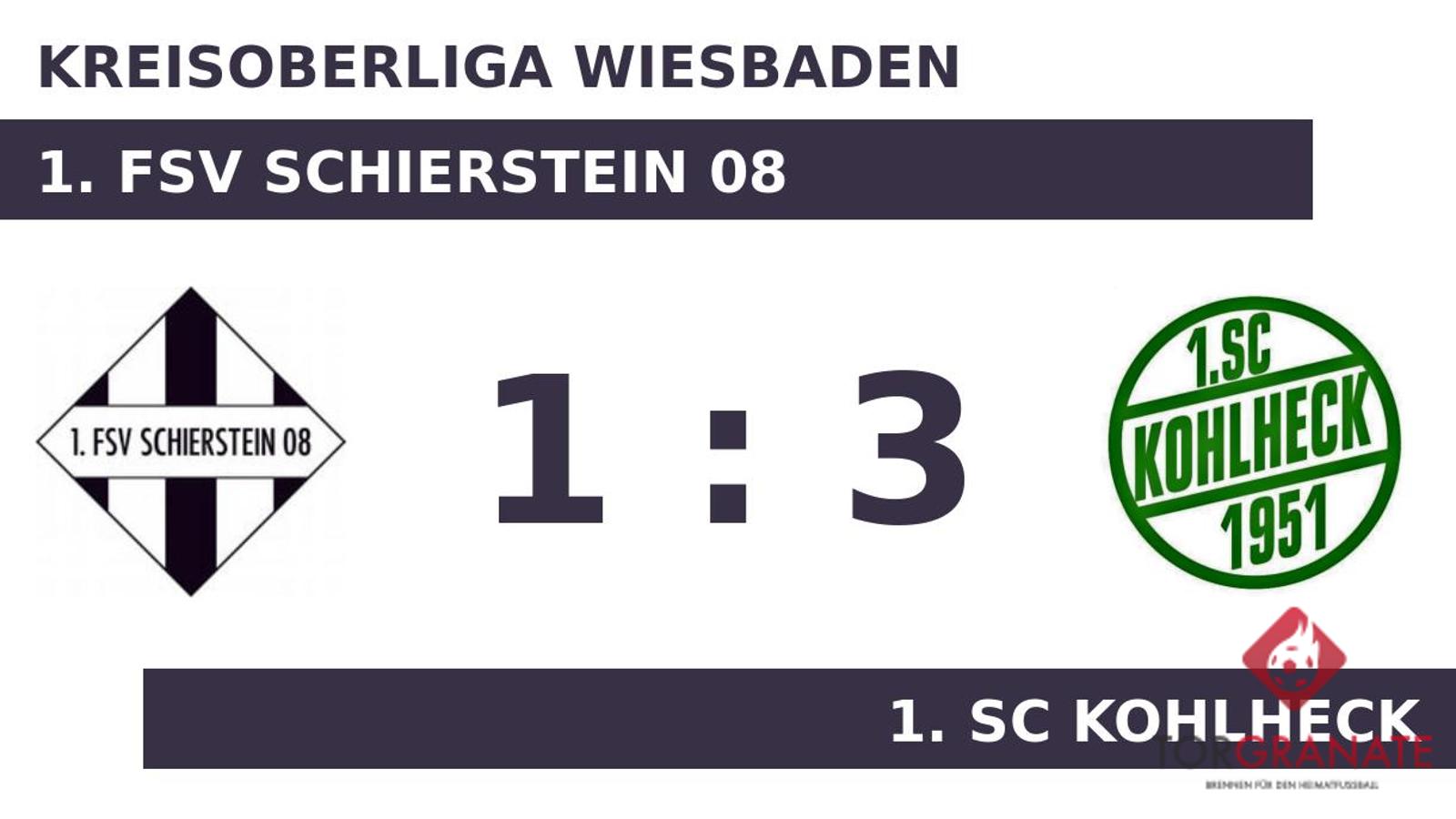 Airidas Rasymas brachte den 1. SC Kohlheck in der 25. Minute in Front. Die Pausenführung des 1. SC Kohlheck fiel knapp aus. Anstelle von Angelo Del Buono war nach Wiederbeginn Lou Jakob Anger für den 1. SC Kohlheck im Spiel. Dennis Schneeweiss beseitigte mit seinen Toren (68./84.) die letzten Zweifel am Sieg des 1. SC Kohlheck. Kurz vor Ultimo war noch Robin Niesen zur Stelle und zeichnete für das erste Tor des 1. FSV Schierstein verantwortlich (89.). Der Unparteiische Matthias Keil (Glashütten) beendete schließlich das Spiel und somit kassierte der Gastgeber eine schmerzliche Niederlage gegen einen direkten Konkurrenten im Abstiegskampf.