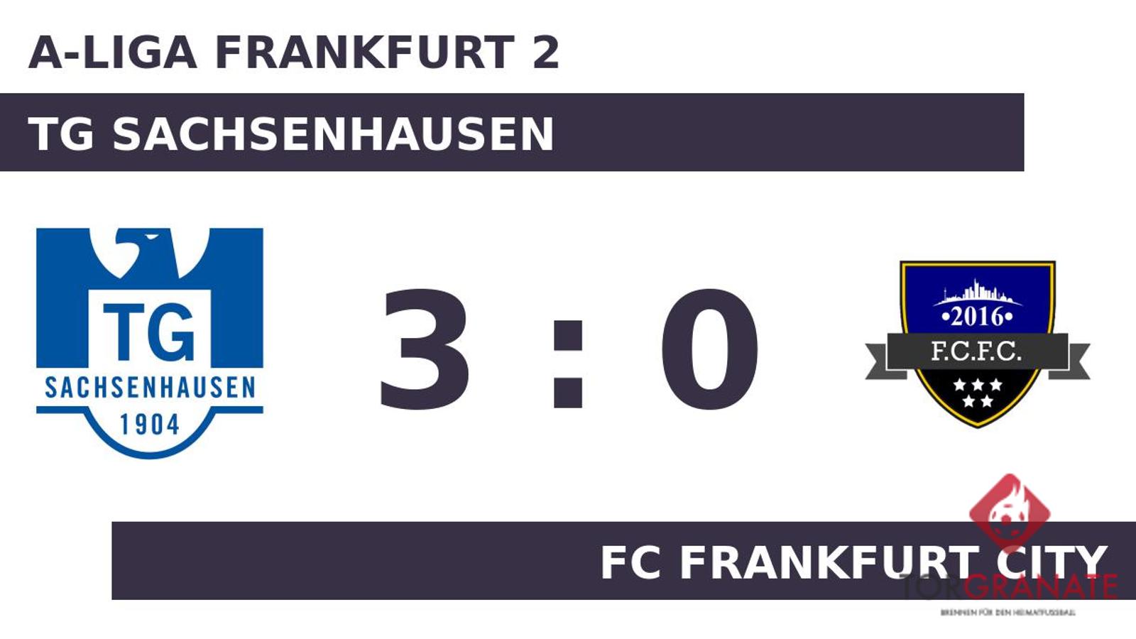 In der 24. Minute fiel der Führungstreffer für die TG Sachsenhausen mit einem Eigentor. Kurz vor dem Pausenpfiff erhöhte Yannik Koch den Vorsprung der Heimmannschaft auf 2:0 (41.). Mit der Führung für die TG Sachsenhausen ging es in die Kabine. Marc Lauter stellte schließlich in der 90. Minute den 3:0-Sieg für die TG Sachsenhausen sicher. Schlussendlich verbuchte die TG Sachsenhausen gegen den FC Frankfurt City einen überzeugenden Heimerfolg.