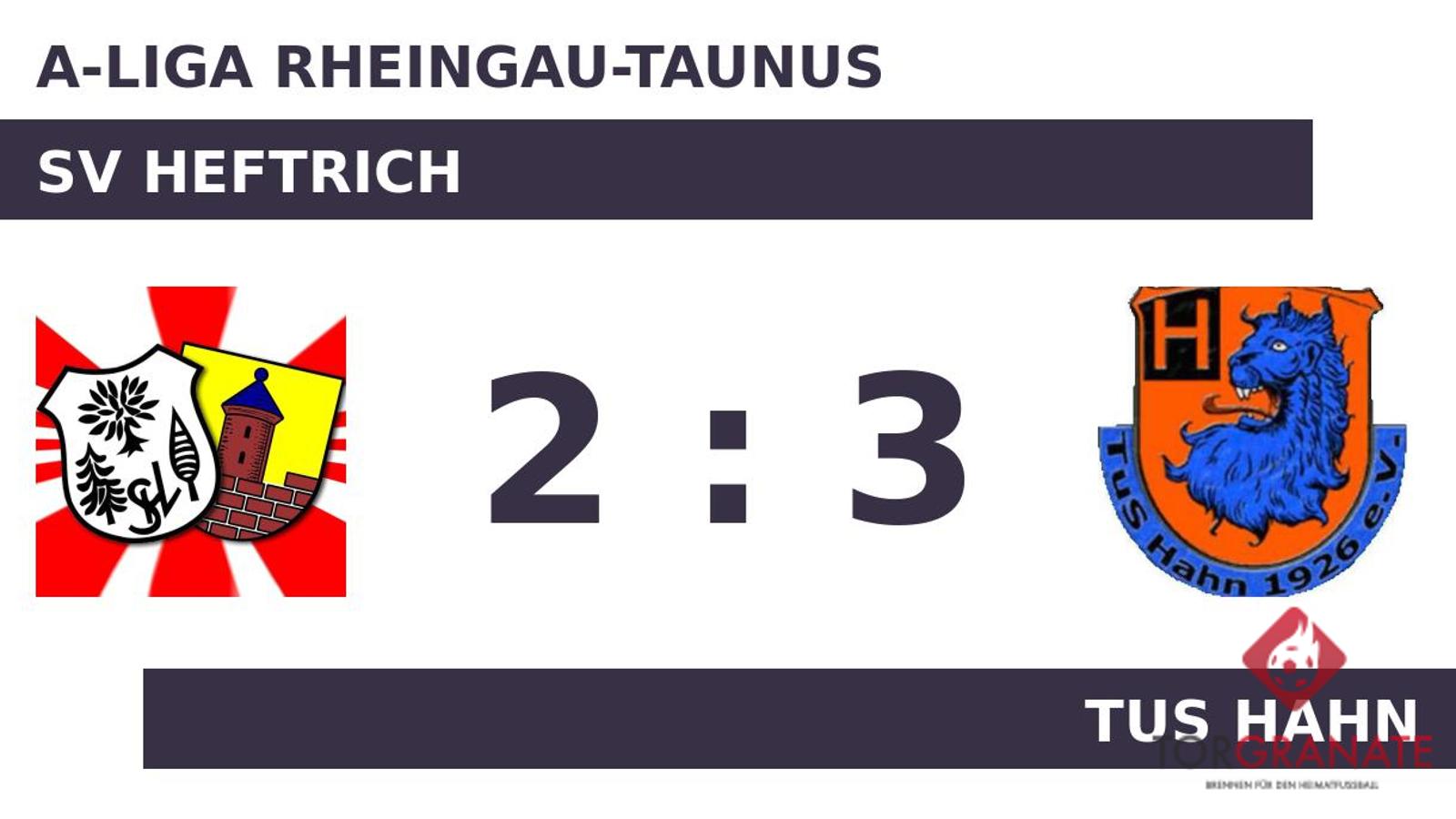 Tom Gregorz brachte den Ball zum 1:0 zugunsten des SV Heftrich über die Linie (21.). Der TuS Hahn hatte sich schnell wieder gesammelt und erzielte in Person von Erik Repp den Ausgleich (25.). Jan Kirchner war zur Stelle und markierte das 2:1 des SV Heftrich (27.). Zum psychologisch wichtigen Zeitpunkt kurz vor der Halbzeit (43.) traf Christian Jachemich zum Ausgleich für den TuS Hahn. Vor dem Seitenwechsel sorgte Felix Kohlstadt mit seinem Treffer für eine kalte Dusche für den SV Heftrich. Zur Pause wusste der TuS Hahn eine hauchdünne Führung auf der Habenseite. In Durchgang zwei lief Job Steiner anstelle von Gregorz für den SV Heftrich auf. Obwohl dem TuS Hahn nach erfolgreicher erster Hälfte keine weiteren Tore gelangen, schaffte es der SV Heftrich zugleich nicht, die Partie zu drehen. Sie endete mit dem Halbzeitstand von 3:2.