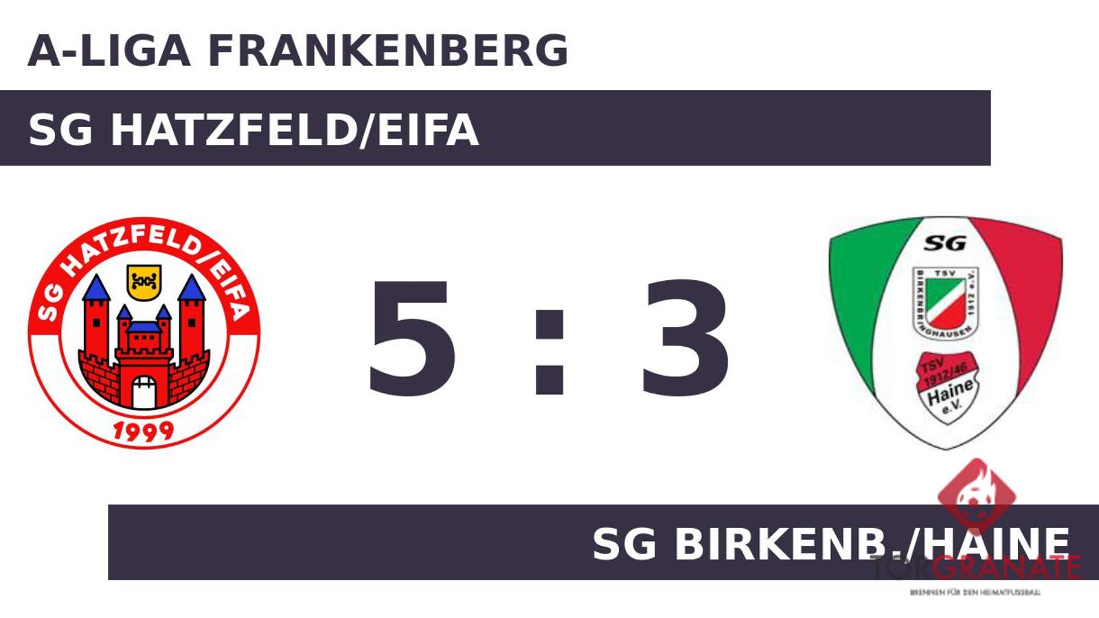 Die SG Birkenb./Haine geriet schon in der siebten Minute in Rückstand, als Lukas Weber das schnelle 1:0 für die SG Hatzfeld/Eifa erzielte. Bereits in der 14. Minute erhöhte Jonas Kleindopp den Vorsprung der SG Hatzfeld/Eifa. Daniel Schneider legte in der 31. Minute zum 3:0 für die SG Hatzfeld/Eifa nach. Die SG Hatzfeld/Eifa dominierte den Gegner zur Pause nach Belieben und ging mit einer deutlichen Führung in die Kabine. Mit dem 4:0 von Maurice Ullmann für die SG Hatzfeld/Eifa war das Spiel eigentlich schon entschieden (46.). Andreas Dehnert verkürzte für die SG Birkenb./Haine später in der 57. Minute auf 1:4. Mit dem 5:1 durch Kleindopp schien die Partie bereits in der 59. Minute mit der SG Hatzfeld/Eifa einen sicheren Sieger zu haben. Das 2:5 der SG Birkenb./Haine stellte k.A. k.A. sicher (69.). Schlussendlich verbuchte die SG Hatzfeld/Eifa gegen den Gast einen überzeugenden Heimerfolg.