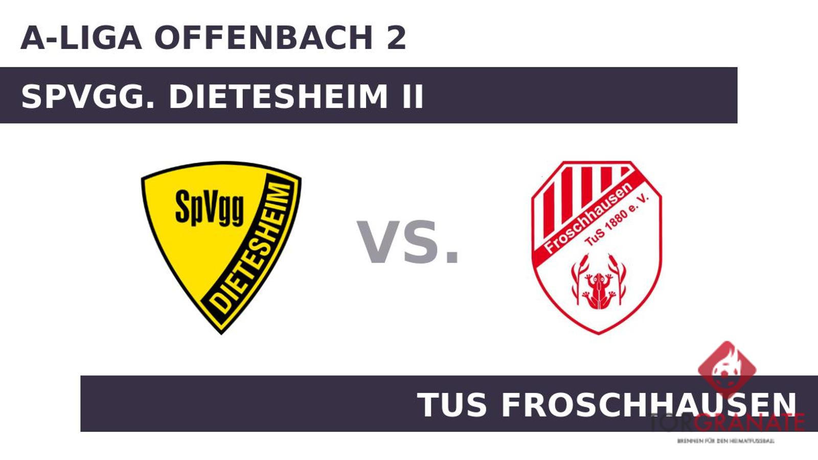 Die Hintermannschaft der Spvgg. Dietesheim II ist gewarnt, im Schnitt trifft die Offensivabteilung der TUS Froschhausen mehr als zweimal pro Spiel ins Schwarze. Beide Mannschaften bewegen sich derzeit in der unteren Hälfte der Tabelle. Die TUS Froschhausen belegt mit 25 Punkten den achten Rang, während die Spvgg. Dietesheim II mit 16 Zählern weniger auf Platz 15 rangiert. Seit vier Spielen wartet die Spvgg. Dietesheim II schon auf einen dreifachen Punktgewinn. Gewinnen hatte bei der TUS Froschhausen zuletzt Seltenheitswert. Der letzte Dreier liegt bereits vier Spiele zurück.