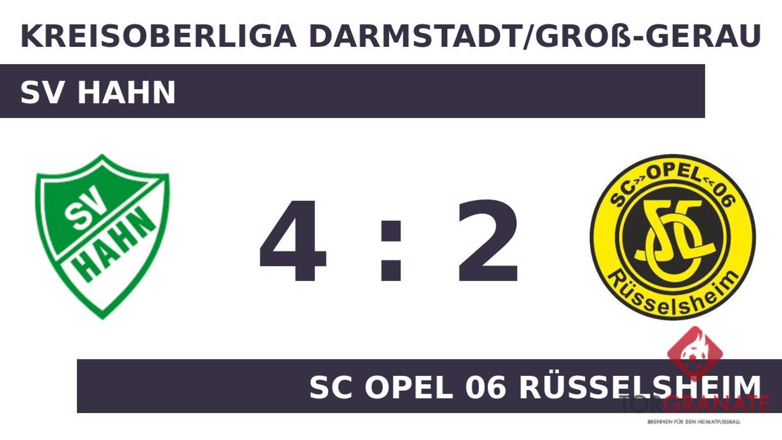 Die Gastgeber erwischten einen Blitzstart ins Spiel. Patrick Saur traf in der ersten Minute zur frühen Führung. Ihsan Celiker versenkte den Ball in der 23. Minute im Netz des SV Hahn. Der SV Hahn gelangte durch ein Selbsttor des SC Opel Rüsselsheim zur 2:1-Führung (33.). Zur Pause behielt der SV Hahn die Nase knapp vorn. Pascal Stork beseitigte mit seinen Toren (60./78.) die letzten Zweifel am Sieg des SV Hahn. Mit dem 2:4 gelang Celiker ein Doppelpack – an der Niederlage änderte dies jedoch auch nichts mehr (79.). Letzten Endes holte der SV Hahn gegen den SC Opel 06 Rüsselsheim drei Zähler.