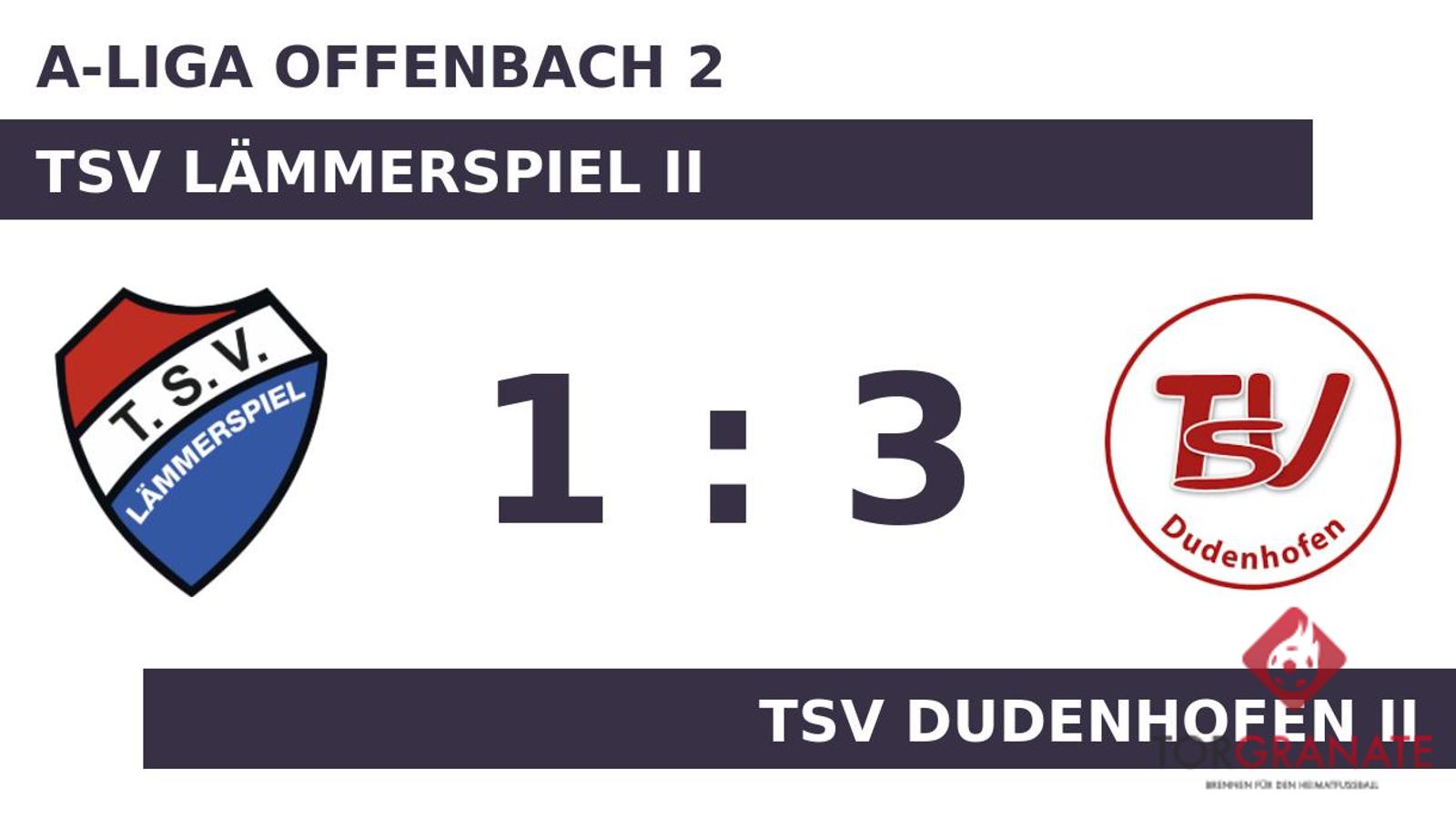TSV Dudenhofen II geriet schon in der neunten Minute in Rückstand, als Michael Ott das schnelle 1:0 für TSV Lämmerspiel II erzielte. Philipp Jankowski nutzte die Chance für TSV Dudenhofen II und beförderte in der 26. Minute das Leder zum 1:1 ins Netz. Am Zwischenstand änderte sich weiter nichts, sodass dieser auch gleichzeitig der Pausenstand war. Tim Jankowski stellte die Weichen für TSV Dudenhofen II auf Sieg, als er in Minute 47 mit dem 2:1 zur Stelle war. Nico Becker verwandelte in der 52. Minute einen Elfmeter und baute den Vorsprung des Gasts auf 3:1 aus. Am Ende punktete TSV Dudenhofen II dreifach bei TSV Lämmerspiel II.