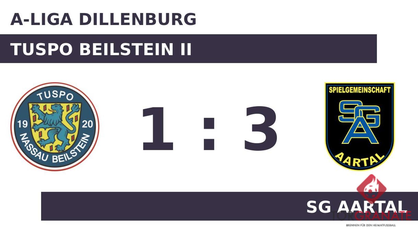 Tim Kessler brachte sein Team in der 29. Minute nach vorn. Malek Mohand Kaci schoss für den Tuspo Beilstein II in der 38. Minute das erste Tor. Zum Seitenwechsel hatte keine Mannschaft die Oberhand gewonnen. Unentschieden lautete der Zwischenstand. Simon Müller stellte die Weichen für die SG Aartal auf Sieg, als er in Minute 49 mit dem 2:1 zur Stelle war. Der Treffer von Christian Kornrumpf in der 77. Minute schürte bei Fans und Spielern die Hoffnung auf den Aufstieg. Am Schluss schlug die SG Aartal den Tuspo Beilstein II mit 3:1.