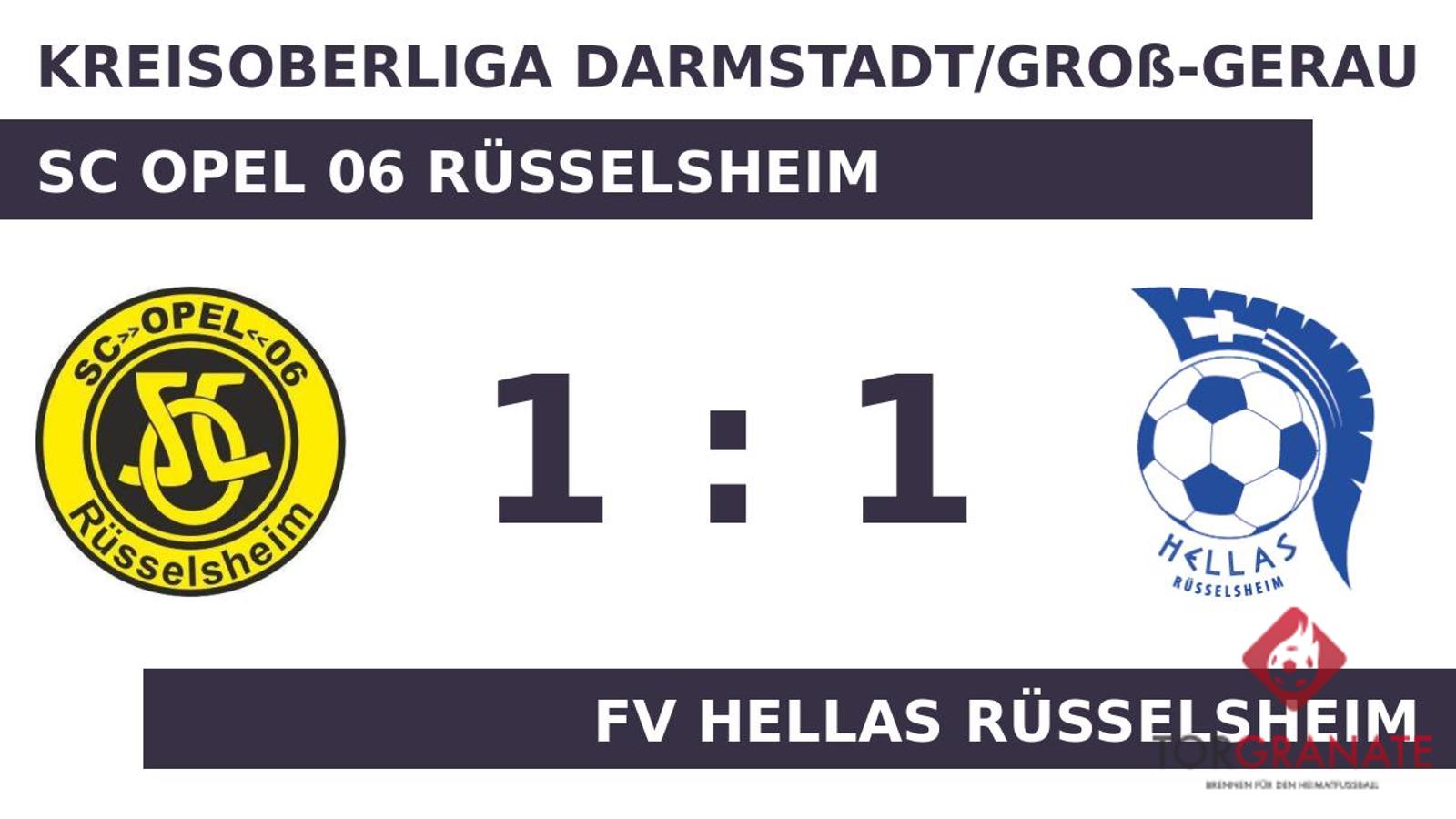 Ihsan Celiker schoss in der 15. Minute vom Elfmeterpunkt das erste Tor des Spiels für den SC Opel 06 Rüsselsheim. Nach nur 28 Minuten verließ Demir Deniz von der Heimmannschaft das Feld, Alexander Machill kam in die Partie. Das 1:1 des FV Hellas Rüsselsheim bejubelte Ioannis Safis (33.). Eine Aussage darüber, wer am Ende die Nase vorn haben würde, war nach dem Abpfiff der ersten Halbzeit noch nicht zu treffen. Es ging mit einem Gleichstand in die Kabinen. Der Schlusspfiff durch den Unparteiischen Mustafa Ayhan (Lützelbach) setzte allen Hoffnungen auf weitere Treffer ein Ende. Es blieb letztlich bei der Punkteteilung.