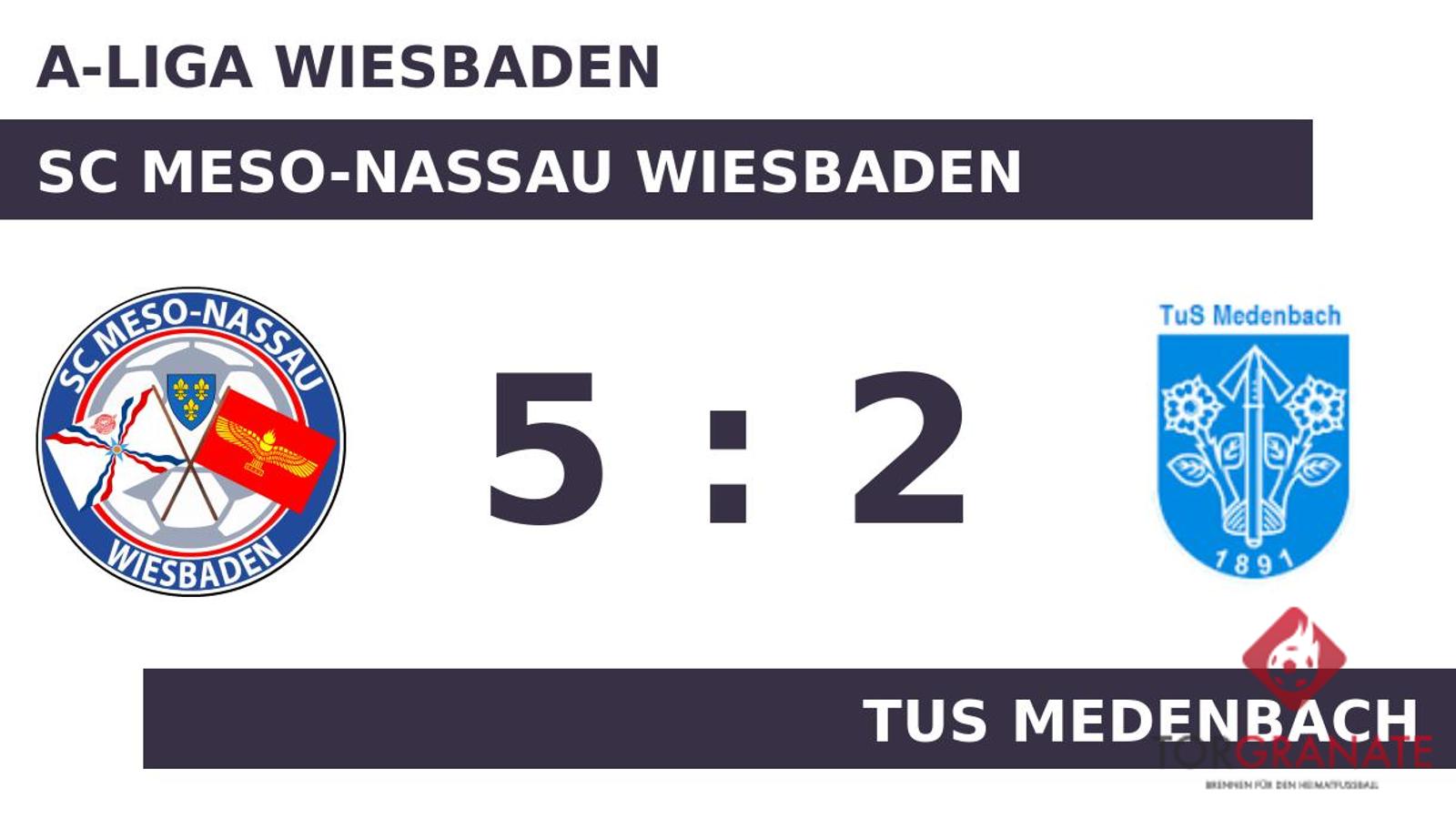 Der SC Meso-Nassau Wiesbaden erwischte einen Blitzstart ins Spiel. Noah Ocak traf in der zweiten Minute zur frühen Führung. Die Gastgeber machten weiter Druck und erhöhten den Spielstand im Eilschritt durch einen Treffer von Abod Barsom (7.). Ein frühes Ende hatte das Spiel für Samuel Yildiz vom SC Meso-Nassau, der in der 14. Minute vom Platz musste und von Gabriel Oez ersetzt wurde. Mit dem 3:0 von Joshua Ercin für den SC Meso-Nassau Wiesbaden war das Spiel eigentlich schon entschieden (33.). Niklas Weckmueller beförderte das Leder zum 1:3 des TuS Medenbach über die Linie (36.). Noch vor der Halbzeit legte Barsom seinen zweiten Treffer nach (43.). Der SC Meso-Nassau dominierte den Gegner zur Pause nach Belieben und ging mit einer deutlichen Führung in die Kabine. Beim TuS Medenbach kam zu Beginn der zweiten Hälfte Sebastian Anna für Lukas Baum in die Partie. In Durchgang zwei lief Felix Scholz anstelle von Marvin Torsten Schild für die Gäste auf. Kurz vor Ultimo war noch Tobias Schuberth zur Stelle und zeichnete für das zweite Tor des TuS Medenbach verantwortlich (90.). Mit dem Tor zum 5:1 steuerte Barsom bereits seinen dritten Treffer an diesem Tag bei (90.). Schlussendlich verbuchte der SC Meso-Nassau Wiesbaden gegen den TuS Medenbach einen überzeugenden Heimerfolg.