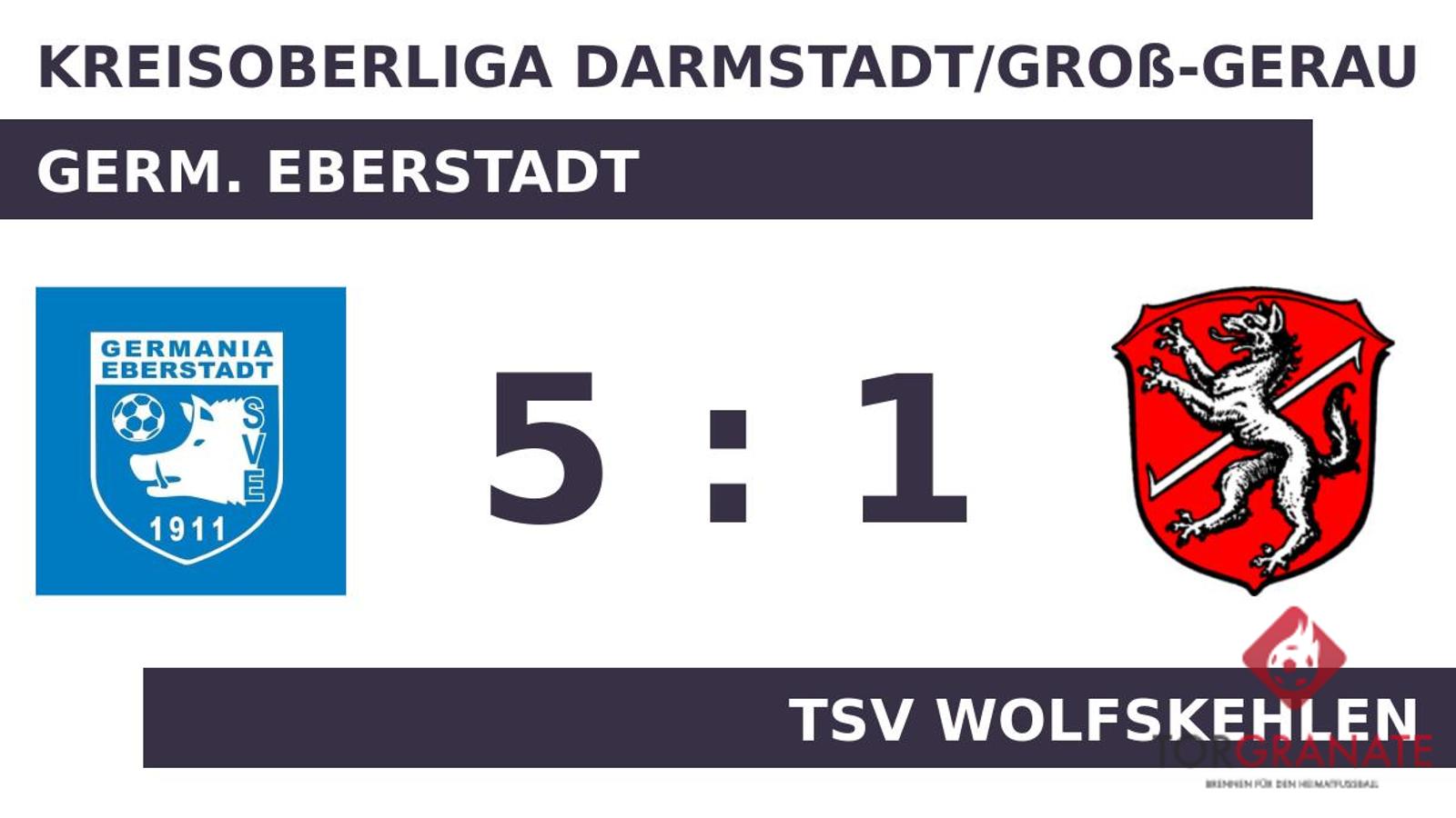 Moritz Knoche versenkte den Ball in der 14. Minute im Netz des Germ. Eberstadt. In der 16. Minute verwandelte Simon Perschke einen Elfmeter zum 1:1 für die Gastgeber. Das letzte Tor der turbulenten Startphase markierte Yannick Binot in der 30. Minute. Um den entscheidenden Deut besser war zur Pause das Germ. Eberstadt, sodass es mit einer dünnen Führung in die Kabine ging. Anstelle von Tobias Münch war nach Wiederbeginn Jonas Schaefer für das Germ. Eberstadt im Spiel. Marius Sperber trug sich in der 57. Spielminute in die Torschützenliste ein. Den Vorsprung des Germ. Eberstadt ließ Pascal Sander in der 62. Minute anwachsen. Binot gelang in den Schlussminuten noch ein weiterer Treffer für das Germ. Eberstadt (86.). Am Ende kam das Germ. Eberstadt gegen den TSV Wolfskehlen zu einem verdienten Sieg.