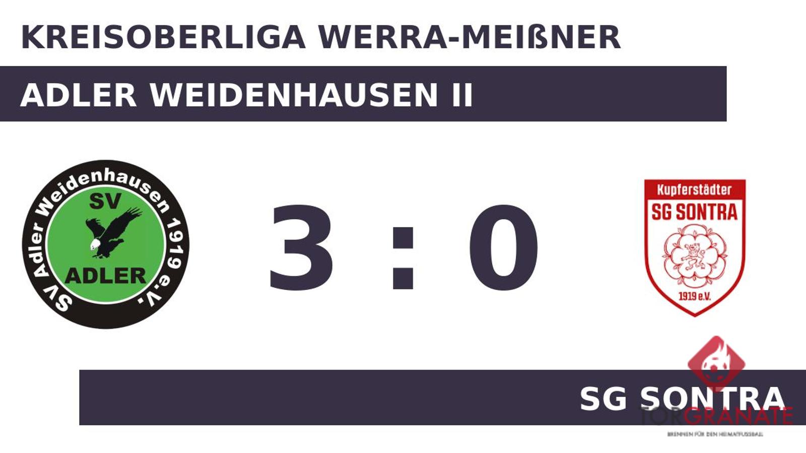 Der SV Adler II ging per Elfmeter von Soroosh Zamani in Führung (13.). Marcel Felmeden trug sich in der 20. Spielminute in die Torschützenliste ein. Die Hintermannschaft der SG Sontra ließ bis zur Pause kein weiteres Tor zu und es ging bei unverändertem Stand in die Kabinen. Maurice Burdzik schraubte das Ergebnis in der 62. Minute mit dem 3:0 für das Adler Weidenhausen II in die Höhe. Letztlich fuhr die Heimmannschaft einen souveränen Erfolg ein, dessen Grundstein im ersten Spielabschnitt gelegt worden war.