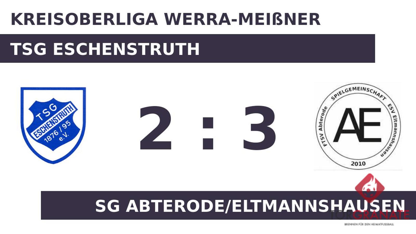 Ehe der Unparteiische Stefan Schindler (Hofgeismar) die Protagonisten zur Pause bat, traf Christoph Schülbe zum 1:0 zugunsten des Gasts (40.). Zur Pause war die SG Abterode/Eltmannshausen im Fahrwasser und verbuchte eine knappe Führung. Mit einem Wechsel – Christoph Meyer kam für Niklas Baasner – startete Abterode/Eltmannsh. in Durchgang zwei. Das 1:1 des TSG Eschenstruth stellte Marcel Umbach sicher (49.). Seare Tewelde brachte der SG Abterode/Eltmannshausen nach 61 Minuten die 2:1-Führung. Für das zweite Tor des TSG Eschenstruth war Arnold Breidt verantwortlich, der in der 73. Minute das 2:2 besorgte. Gefeierter Mann des Spiels war Schülbe, der Abterode/Eltmannsh. mit seinem Treffer in der 88. Minute den Vorsprung brachte. Am Ende behielt die SG Abterode/Eltmannshausen gegen den TSG Eschenstruth die Oberhand.