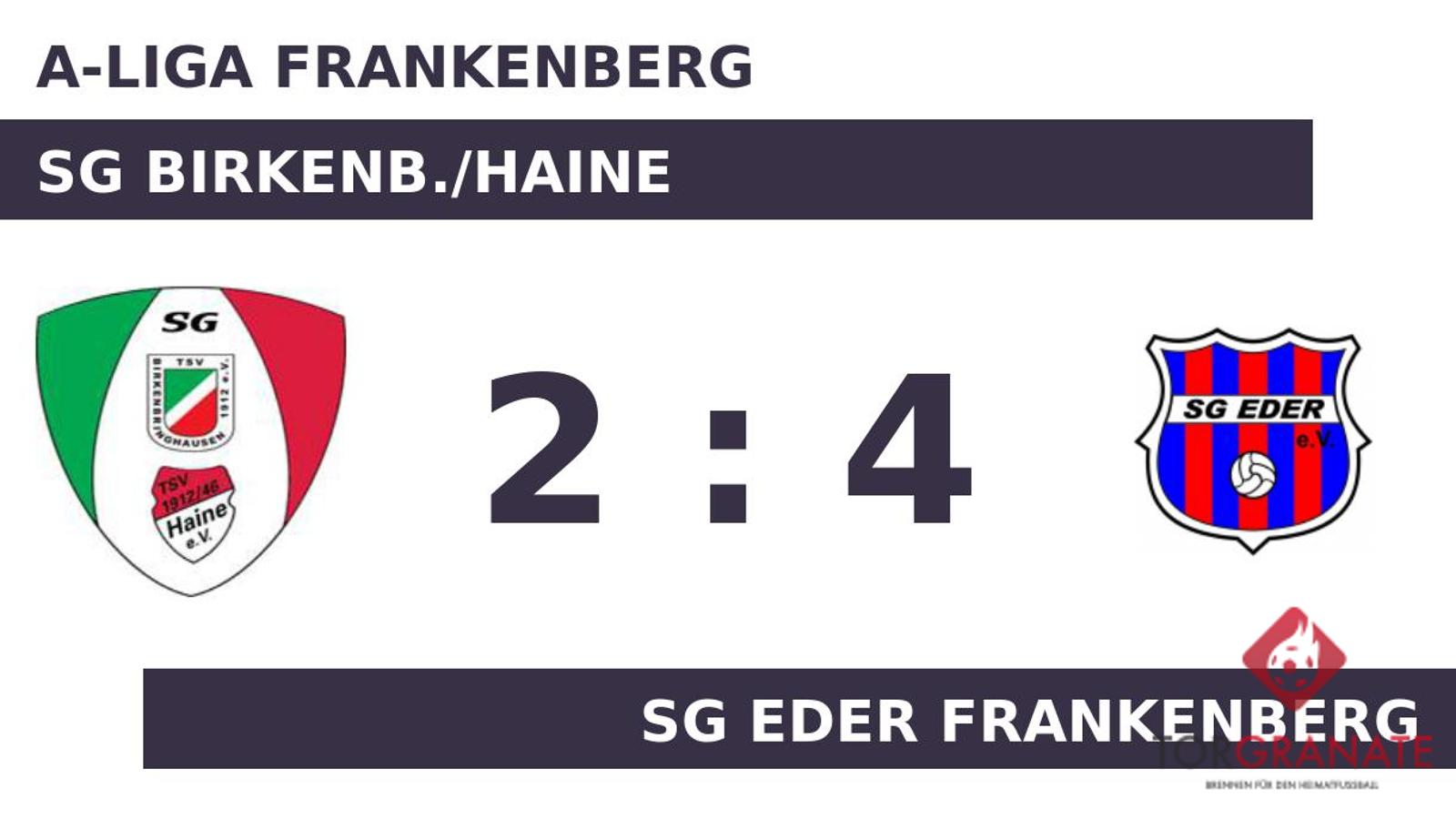 Die SG Birkenb./Haine geriet schon in der siebten Minute in Rückstand, als Fabrizio Paar das schnelle 1:0 für die SG Eder Frankenberg erzielte. Die passende Antwort hatte Andreas Dehnert parat, als er in der zwölften Minute zum Ausgleich traf. Der Treffer zum 2:1 sicherte der SG Eder Frankenberg nicht nur die Führung – es war auch bereits der zweite von Paar in diesem Spiel (25.). In der 33. Minute stellte die SG Birkenb./Haine personell um: Per Doppelwechsel kamen Heiko Schulze und Marco Wroblewski auf den Platz und ersetzten Marcel Stahl und Alexander Tisch. Im ersten Durchgang hatte die SG Eder Frankenberg etwas mehr Zug zum Tor und ging mit einem knappen Vorsprung in die Kabine. Das 3:1 für die SG Eder Frankenberg stellte Paar sicher. In der 65. Minute traf er zum dritten Mal während der Partie. Für das 4:1 der SG Eder Frankenberg sorgte Luan Hasanaj, der in Minute 75 zur Stelle war. In der 90. Minute brachte k.A. k.A. das Netz für die SG Birkenb./Haine zum Zappeln. Letzten Endes holte die SG Eder Frankenberg gegen die Heimmannschaft drei Zähler.