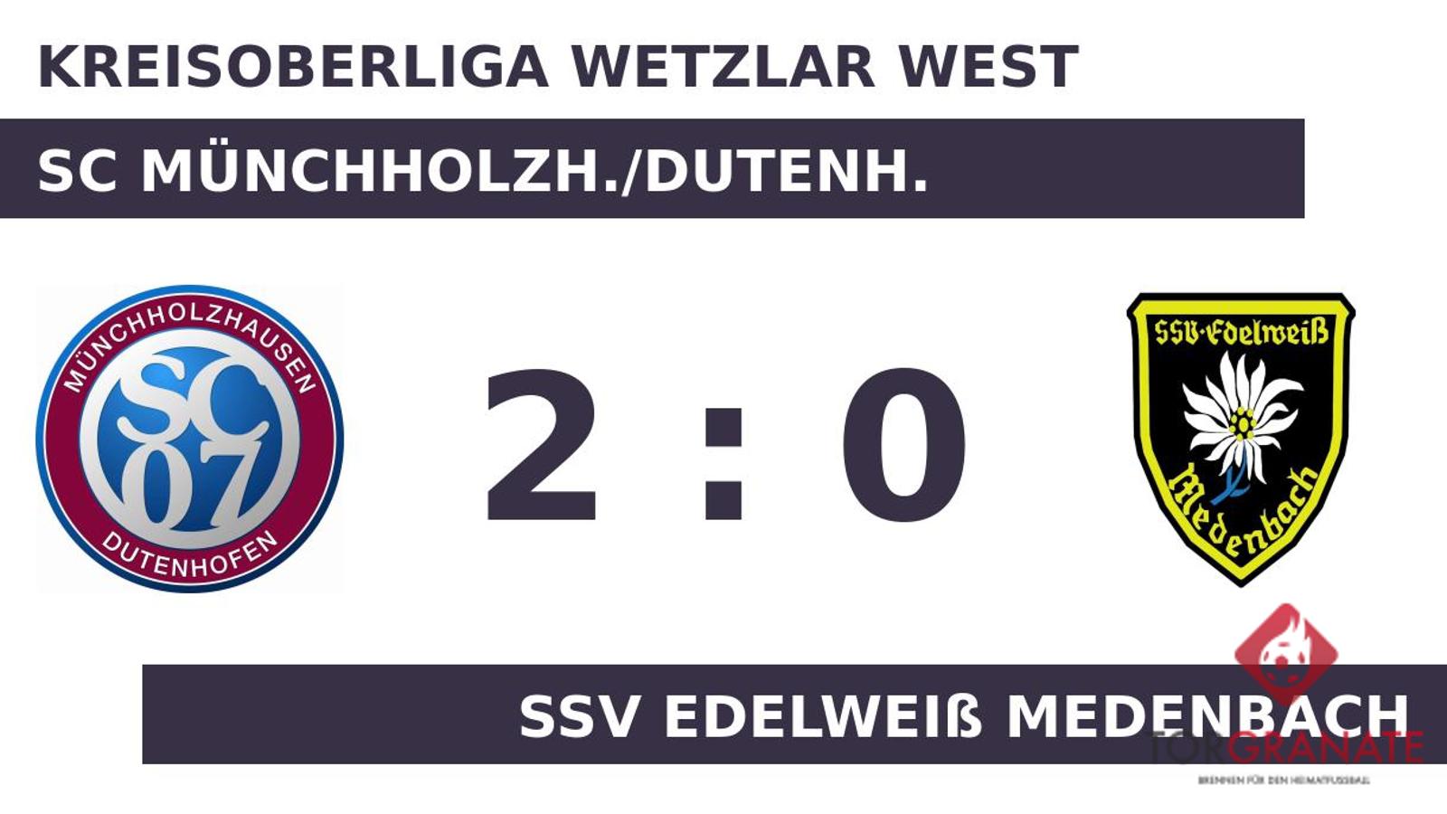 Im ersten Durchgang tasteten sich die beiden Mannschaften lediglich ab, Tore gab es nicht zu verzeichnen. In Durchgang zwei lief Jan Robin Baumann anstelle von Marc Ramser für den SC Münchholzh./Dutenh. auf. In der 60. Minute stellte das Edelweiß Medenbach personell um: Per Doppelwechsel kamen Elias Jonathan Seiler und Louis Sahm auf den Platz und ersetzten Marvin Maurer und Timo Strassen. Inthujan Karunakaromoorthy brach für das Münchholzh./Dutenh. den Bann und markierte in der 73. Minute die Führung. Enis Sefic war es, der kurz vor Ultimo das 2:0 besorgte und die Heimmannschaft inklusive Anhang damit von höheren Gefilden träumen lässt (90.). Am Ende verbuchte der SC Münchholzh./Dutenh. gegen den SSV Edelweiß Medenbach die maximale Punkteausbeute.