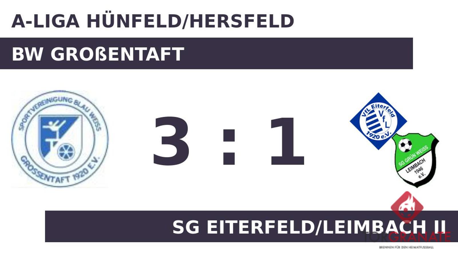 Die SG erwischte einen Blitzstart ins Spiel. Andre Kretschmer traf in der vierten Minute zur frühen Führung. Für das 1:1 von BW Großentaft zeichnete Thomas Winter verantwortlich (11.). Kamil Bontal versenkte die Kugel zum 2:1 (33.). Zur Pause behielt BW Großentaft die Nase knapp vorn. Ehe der Abpfiff ertönte, war es Michael Wiegand, der das 3:1 aus Sicht der Sportvereinigung perfekt machte (88.). Am Schluss siegte BW Großentaft gegen die SG Eiterfeld/Leimbach II.