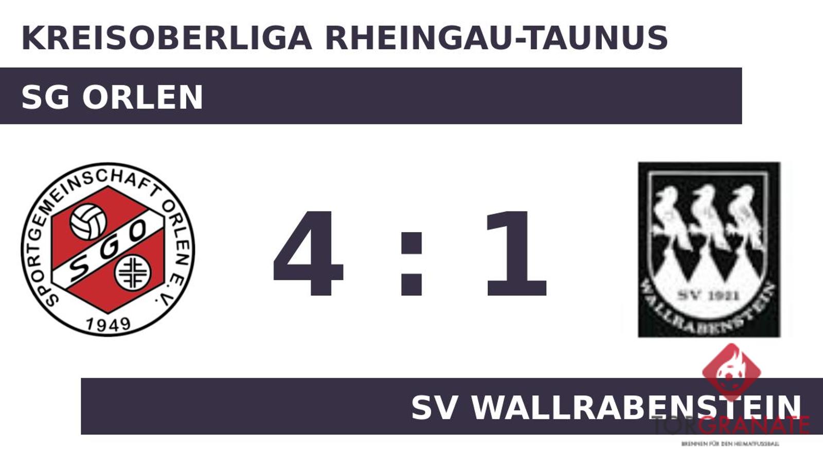 Lucas Federl trug sich in der 16. Spielminute in die Torschützenliste ein. In der 27. Minute brachte Ante Beslic das Netz für die SG Orlen zum Zappeln. Ein Eigentor der SG Orlen in der 37. Minute brachte dem SV Wallrabenstein den 1:2-Anschluss. Zum psychologisch ungünstigen Zeitpunkt vor der Halbzeit (42.) schoss Finn Ott einen weiteren Treffer für die SG Orlen. Kurz vor dem Halbzeitpfiff (43.) baute Ali Altimimi die Führung der SG Orlen aus. Das überzeugende Auftreten der SG Orlen fand Ausdruck in einer klaren Halbzeitführung. Kurz vor dem Ende des Spiels nahm das Wallrabenstein noch einen Doppelwechsel vor, sodass David Jordan und Sejo Tutic für Joshua Niederle und Samed Muric weiterspielten (89.). Der Unparteiische Jan Schubert (Limburg) beendete das Spiel, nachdem die zweite Hälfte gemessen an den Toren nicht mit dem ersten Spielabschnitt mitgehalten hatte. Es blieb folglich beim souveränen 4:1, das die SG Orlen bereits vor der Pause unter Dach und Fach brachte.