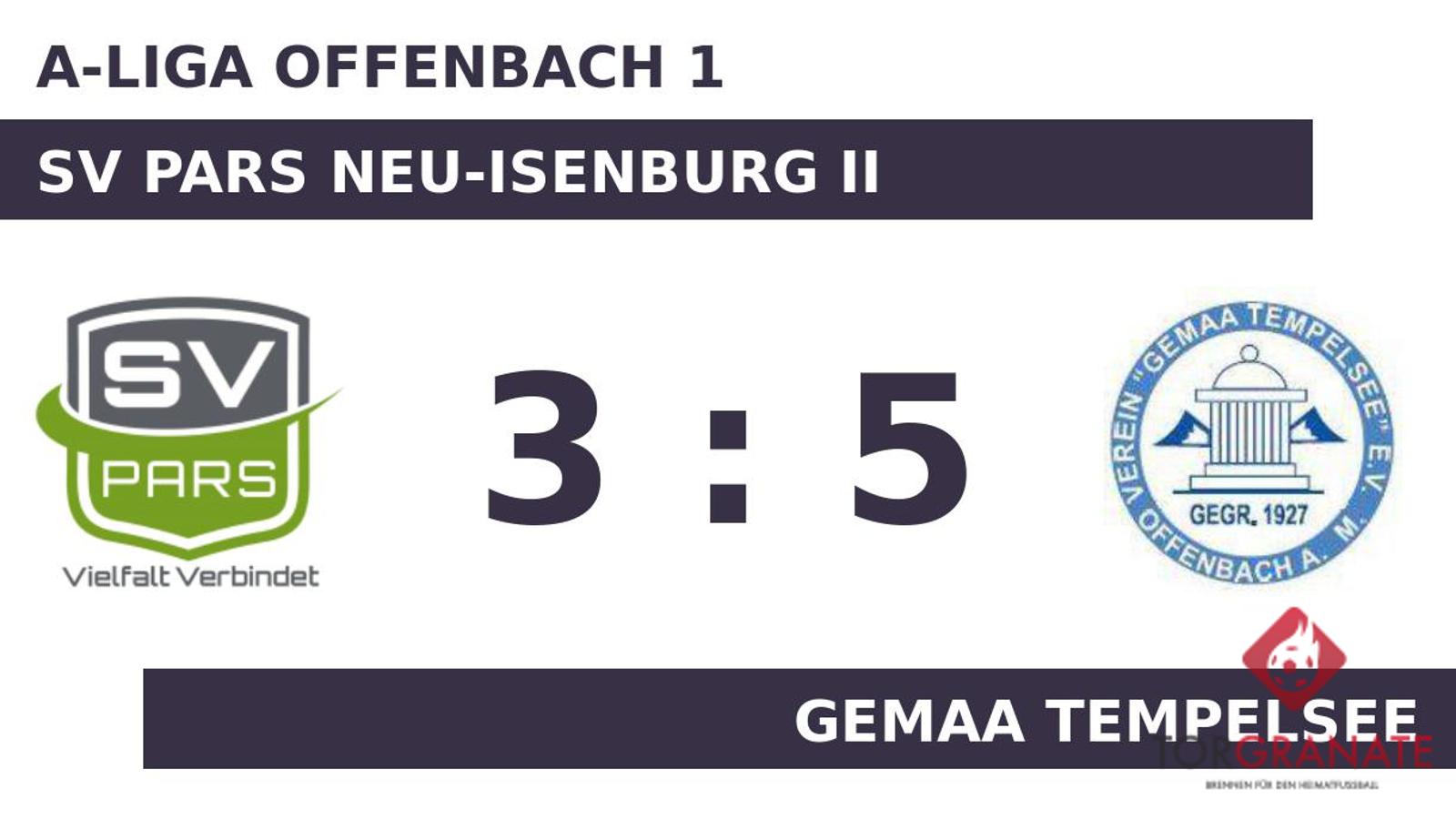 Das Gemaa Tempelsee geriet schon in der zehnten Minute in Rückstand, als Elias Tekalegn Tesema das schnelle 1:0 für den SV Pars Neu-Isenburg II erzielte. Ein Eigentor des Pars Neu-Isenburg II in der 17. Minute brachte dem Gemaa Tempelsee den 1:2-Anschluss. Das 2:0 des SV Pars Neu-Isenburg II stellte Dennis Ziegler sicher (17.). Der Gastgeber konnte mit dem ersten Durchgang sehr zufrieden sein. Trotzdem gab es Veränderungen beim Pars Neu-Isenburg II. Giuseppe Lo Cicero ersetzte Florian Boenicke, der nun schon vorzeitig Feierabend machte. Die Hintermannschaft des Gemaa Tempelsee ließ bis zur Pause kein weiteres Tor zu und es ging bei unverändertem Stand in die Kabinen. Durchsetzungsstark zeigte sich das Gemaa Tempelsee, als Muharrem Katilmis (60.) und Achraf Aljatari (68.) schnell nacheinander im gegnerischen Strafraum zuschlugen. Katilmis beseitigte mit seinen Toren (76./83.) die letzten Zweifel am Sieg des Gemaa Tempelsee. Kurz vor Ultimo war noch Denis Smisek zur Stelle und zeichnete für das dritte Tor des SV Pars Neu-Isenburg II verantwortlich (87.). Das Pars Neu-Isenburg II ließ nach dem Wiederanpfiff stark nach und bot dem Gemaa Tempelsee nicht mehr Paroli, sodass das Polster der ersten Halbzeit nicht einmal für ein Unentschieden reichte.
