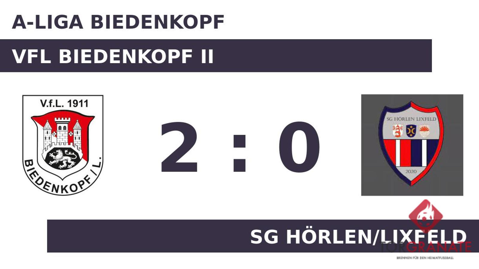 Der Gast geriet schon in der zehnten Minute in Rückstand, als Alessandro Gamma das schnelle 1:0 für den VfL Biedenkopf II erzielte. Weitere Tore gab es bis zum Pausenpfiff nicht und so ging es mit der Führung des VfL Biedenkopf II in die Kabine. Jan Marek Cegledi erhöhte den Vorsprung des Gastgebers nach 62 Minuten auf 2:0. Mit dem Schlusspfiff durch Referee Calvin Issel (Dillenburg) siegte der VfL Biedenkopf II gegen die SG Hörlen/Lixfeld.
