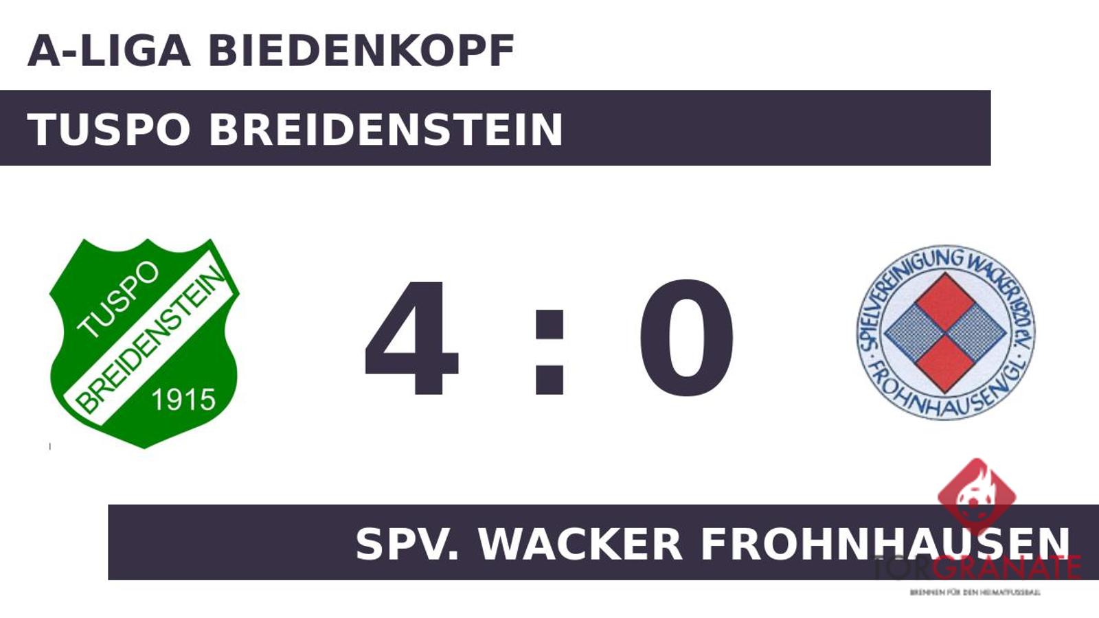 In der siebten Minute fiel der Führungstreffer für den TuSpo Breidenstein per Eigentor. Das Heimteam machte weiter Druck und erhöhte den Spielstand im Eilschritt durch einen Treffer von Daniel Gruber (8.). Lukas Becker vollendete zum dritten Tagestreffer in der 18. Spielminute. Eigentlich war die Spv. Frohnhausen schon geschlagen, als Jannis Henkel das Leder zum 0:4 über die Linie beförderte (32.). Bis zum Schlusspfiff durch den Unparteiischen betrieben die Gäste nach einem desolaten ersten Spielabschnitt in Halbzeit zwei Schadensbegrenzung und verhinderten eine noch höhere Pleite. Am Ende hieß es 4:0 zugunsten des TuSpo Breidenstein.