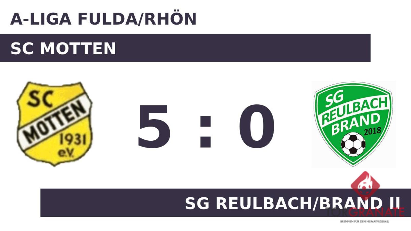 Reulbach/Brand II geriet schon in der achten Minute in Rückstand, als Manuel Bug das schnelle 1:0 für den SC Motten erzielte. Der SC Motten machte weiter Druck und erhöhte den Spielstand im Eilschritt durch einen Treffer von Kilian Herbert (9.). Mit dem 3:0 von Jannik Müller für den SCM war das Spiel eigentlich schon entschieden (20.). Der Halbzeitpfiff war noch nicht ertönt, als Herbert seinen zweiten Treffer nachlegte (44.). Der SC Motten hatte die Chancen genutzt und blickte zur Pause auf einen deutlichen Vorsprung. Mit einem Wechsel – Niklas Reith kam für Philipp Faulstich – startete die SG Reulbach/Brand II in Durchgang zwei. Das 5:0 für den SC Motten stellte Herbert sicher. In der 82. Minute traf er zum dritten Mal während der Partie. Am Ende fuhr der SC Motten einen deutlichen Sieg ein. Dabei demonstrierte der SC bereits in Hälfte eins großes Leistungsvermögen, als man Reulbach/Brand II in Grund und Boden spielte.