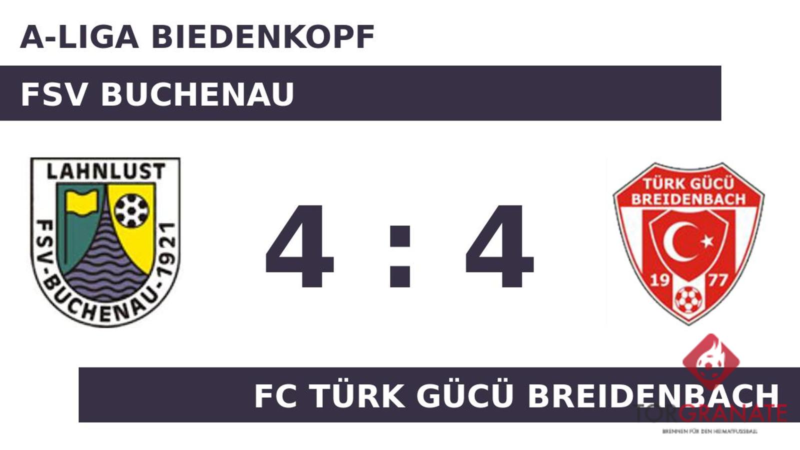 Das TG Breidenbach erwischte einen Blitzstart ins Spiel. Murat Bicen traf in der fünften Minute zur frühen Führung. Die Gäste machten weiter Druck und erhöhten den Spielstand im Eilschritt durch einen Treffer von Raynell Völk (10.). Durch ein Eigentor kam der FSV Buchenau noch einmal ran (27.). Die Gastgeber waren gewillt auszugleichen. Bis zum Seitenwechsel sprang jedoch nichts Zählbares mehr heraus. Die nächsten beiden Treffer waren einem Mann vorbehalten: Burak Aksoy schnürte einen Doppelpack (53./65.), sodass der FC Türk Gücü Breidenbach fortan mit 4:1 führte. Für das 2:4 des FSV Buchenau zeichnete Timo Bernhardt verantwortlich (81.). Es folgte der Anschlusstreffer für den FSV Buchenau – bereits der zweite für Timo Bernhardt. Nun stand es nur noch 3:4 (90.). Mit seinem Treffer aus der 90. Minute bewahrte Sven Brunet seine Mannschaft vor der Niederlage und machte kurz vor dem Abpfiff das Remis perfekt. Am Ende stand es zwischen dem FSV Buchenau und dem TG Breidenbach pari.