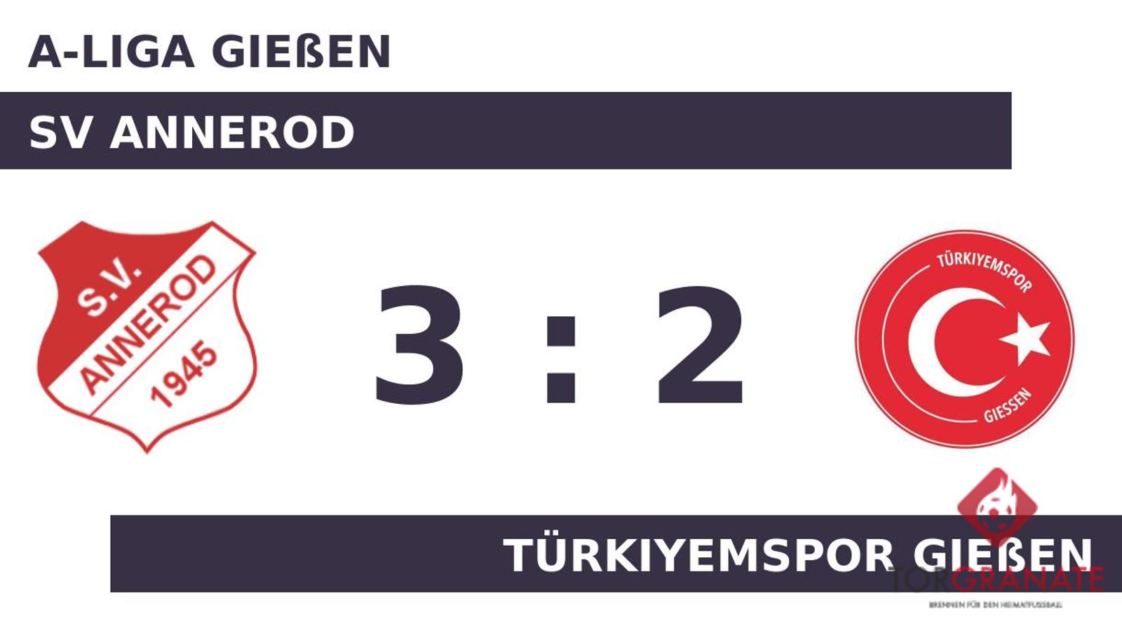 Das Türkiyemspor Gießen geriet schon in der zehnten Minute in Rückstand, als Lucas Smajek das schnelle 1:0 für den SV Annerod erzielte. Der Schiedsrichter schickte schließlich beide Mannschaften ohne weitere Änderung am Spielstand in die Kabinen. Das 1:1 des Türkiyemspor Gießen bejubelte Tarkan Genc (57.). Jawid Atschaksai brachte den Gästen nach 70 Minuten die 2:1-Führung. Für das Türkiyemspor Gießen nahm das Match in der Schlussphase die bittere Wende. Christian Plan drehte den Spielstand mit einem Doppelpack (75./80.) und sicherte dem SV Annerod einen Last-Minute-Sieg. Am Schluss schlug der SV Annerod das Türkiyemspor Gießen mit 3:2.
