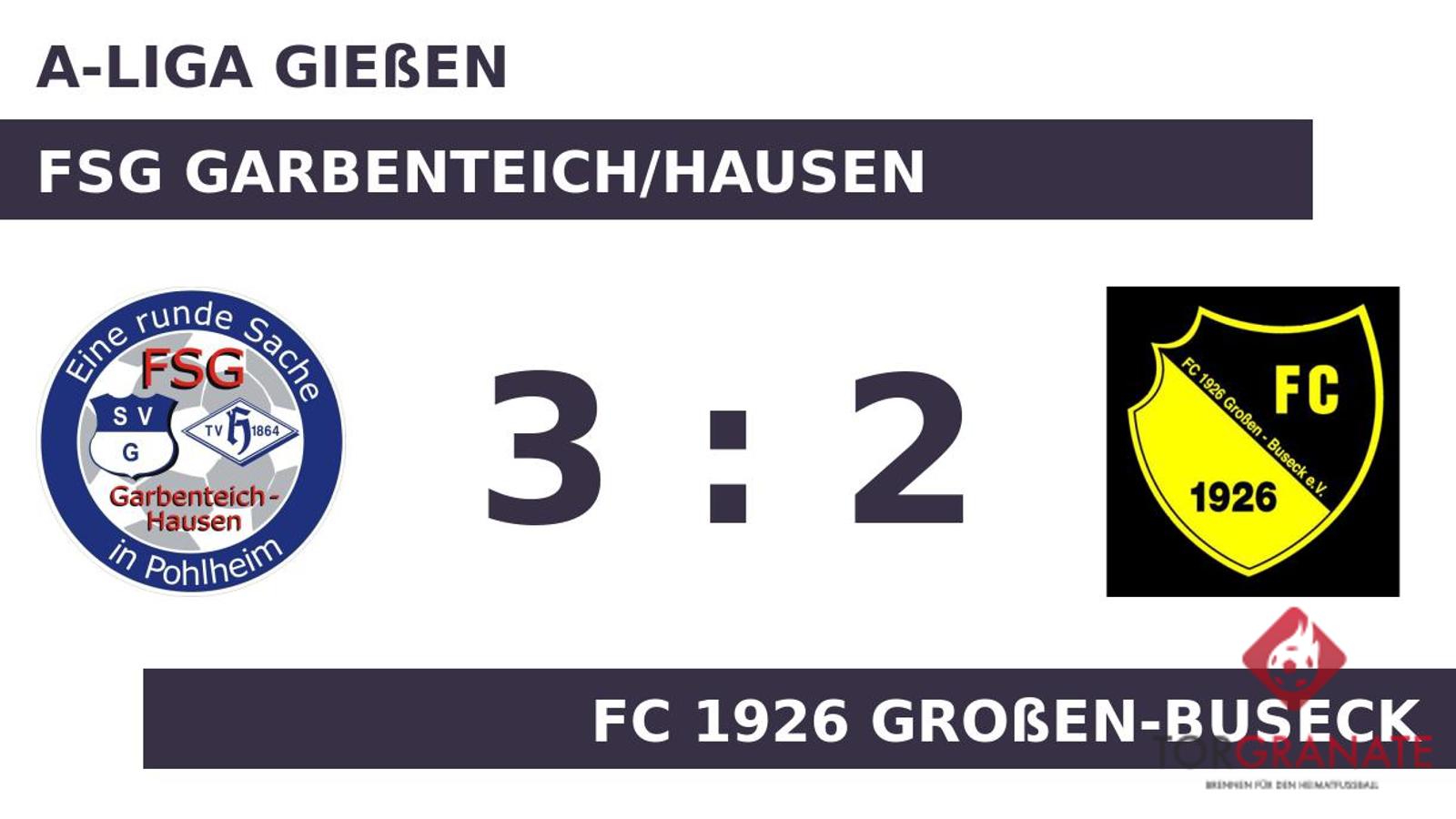 Für das 1:0 und 2:0 war Jannik Wockelmann verantwortlich. Der Akteur traf gleich zweimal ins Schwarze (25./41.). Wenige Momente vor dem Seitenwechsel war Konrad Böttger mit dem 1:2 für den FC Großen-Buseck zur Stelle (43.). Mit einem Tor Vorsprung für die FSG Garbenteich/Hausen ging es für die beiden Teams in die Halbzeitpause. In der 77. Minute verwandelte Lukas Genslein einen Elfmeter zum 3:1 für die Gastgeber. Kai Uwe Siering verkürzte für den FC 1926 Großen-Buseck später in der 88. Minute auf 2:3. Am Schluss siegte die Garbenteich/Hausen gegen den Gast.