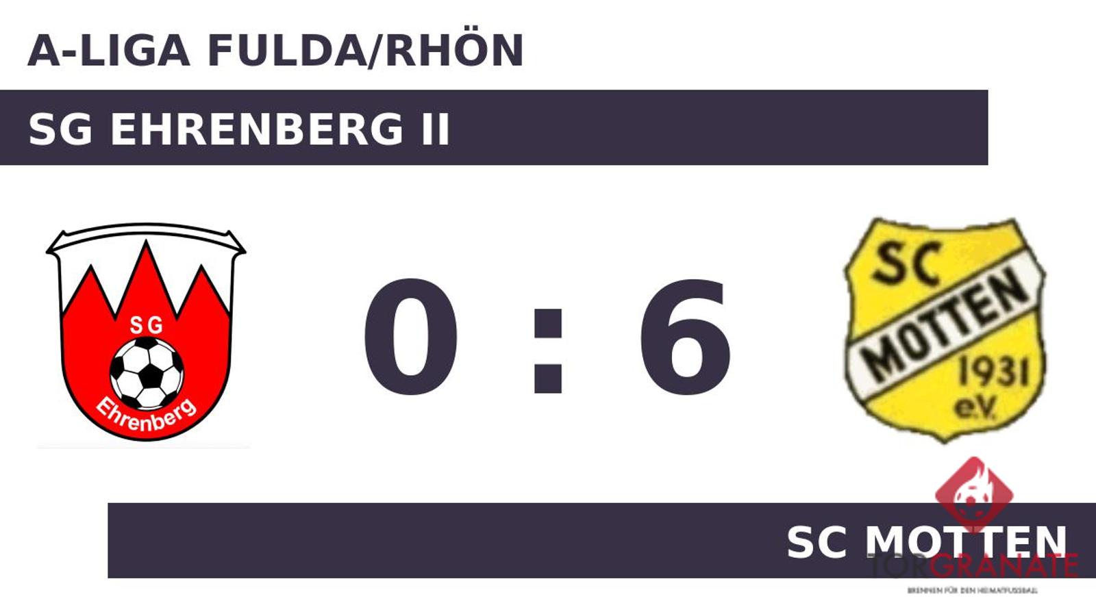 Für das 1:0 und 2:0 war Julius Mott verantwortlich. Der Akteur traf gleich zweimal ins Schwarze (7./20.). Das letzte Tor der turbulenten Startphase markierte Jeremias Mott in der 25. Minute. Die SG Ehrenberg II rettete sich mit einem deutlichen Rückstand in die Halbzeitpause. Für das 4:0 des SC Motten sorgte Manuel Bug, der in Minute 65 zur Stelle war. Jonathan Mott vollendete zum fünften Tagestreffer in der 80. Spielminute. Ehe der Abpfiff ertönte, war es Lukas Leibold, der das 6:0 aus Sicht des SC Motten perfekt machte (90.). Mit dem Schlusspfiff durch Schiedsrichter Mathias Lüdecke (Fulda) fuhren die Mottener einen Kantersieg ein, der sich schon vor der Halbzeitpause abgezeichnet hatte.