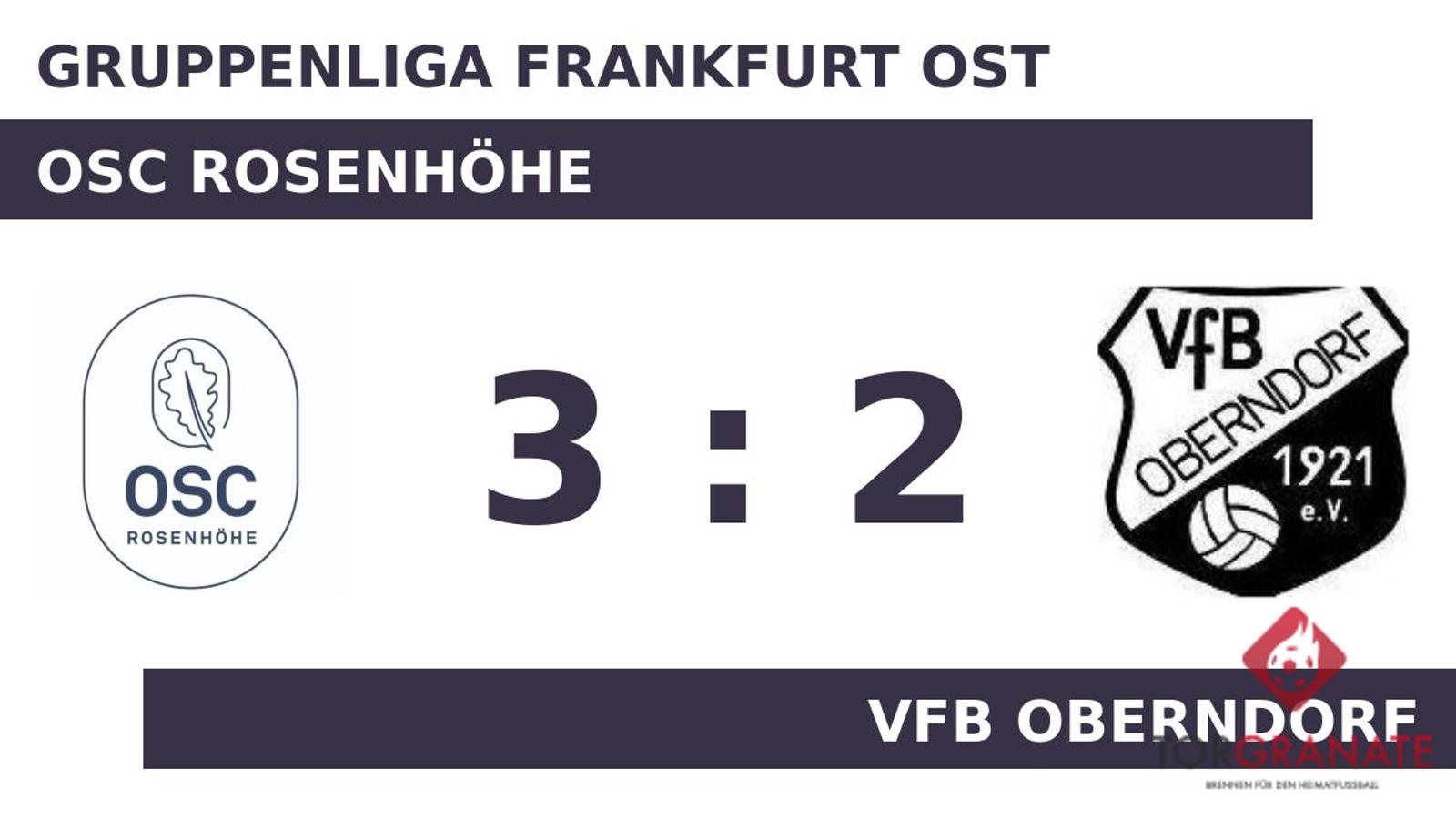 Der OSC Rosenhöhe geriet schon in der achten Minute in Rückstand, als Kai Helmchen das schnelle 1:0 für den VfB Oberndorf erzielte. Daniel Pfitzer ließ sich in der 33. Minute nicht zweimal bitten und verwertete zum 1:1 für den OSC Rosenhöhe. Als manch einer bereits mit den Gedanken in der Halbzeitpause war, besorgte Daniel Sachs auf Seiten des OSC das 2:1 (42.). Die Rosenhöhe hatte zur Pause eine knappe Führung auf dem Zettel stehen. Almir Muminovic war es, der in der 83. Minute das Spielgerät im Tor der OSCler unterbrachte. Das Heimteam nahm in der 86. Minute einen Wechsel zweier etatmäßiger Verteidiger vor, als Berkay Harmanci für Mike Wenzel vom Platz ging. Zum spielentscheidenden Akteur avancierte Christian Rüger, der mit seinem Treffer in der 87. Minute die späte Führung des OSC Rosenhöhe sicherstellte. Nach Beendigung der zweiten Halbzeit hieß das Ergebnis 3:2 zugunsten des OSC Rosenhöhe.