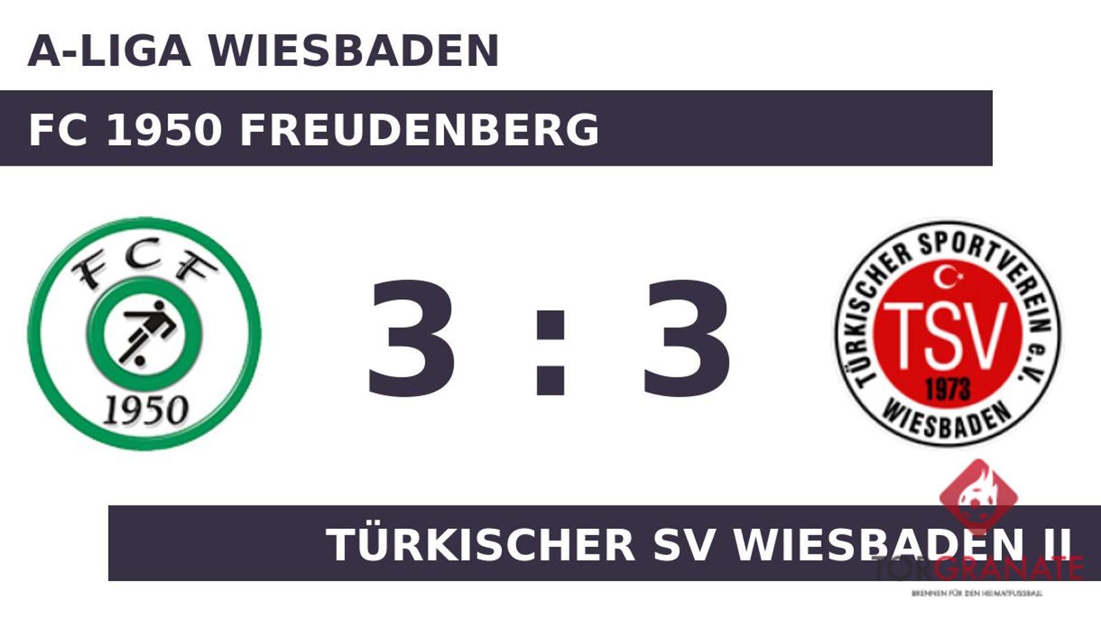 Kaum war das Spiel angepfiffen, lagen die Gastgeber bereits in Front. Brahim Azzaoui markierte in der ersten Minute die Führung. Lange währte die Freude des FC 1950 Freudenberg nicht, denn schon in der fünften Minute schoss Ahmettugra Akdemir den Ausgleichstreffer für den Türkischer SV Wiesbaden II. Eine Minute später ging der FC 1950 Freudenberg durch den zweiten Treffer von Azzaoui in Führung. Den Freudenjubel des FC 1950 Freudenberg machte Filip Vicentic zunichte, als er kurz darauf den Ausgleich besorgte (40.). Vor dem Seitenwechsel sorgte Benjamin Aziz Nefatti mit seinem Treffer für eine kalte Dusche für den FC 1950 Freudenberg. Ein Tor auf Seiten des Türkischer SV II machte zur Pause den Unterschied zwischen den beiden Mannschaften aus. In der 56. Minute brachte Youness Oumoussa den Ball im Netz der Gäste unter. Am Schluss hatte im Duell der beiden Mannschaften keine die Oberhand gewonnen und so trennten sich der FC 1950 Freudenberg und der Türkischer SV Wiesbaden II schließlich mit einem Remis.